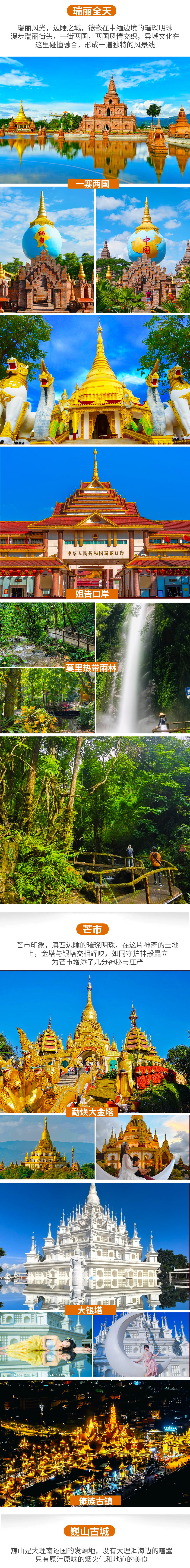 早餐后出发,前往【瑞丽】。先走进【一国两寨】,有很多横跨在国境线上的景观,一树两国,一桥两国,一井两国,甚至一个秋千,都能荡到缅甸去。寨子里的老百姓语言相通、习俗相同,他们同走一条路,共饮一井水,同赶一场集,和睦相处。 随后到达【瑞丽姐告国门】,它见证了中缅边贸繁荣发展的历程,这里还有商贸试点区、以及边境商城,如今的第四代国门,雄伟壮观、气势恢宏,来来往往的各国商人进出国门,好不热闹,是来到德宏必打卡点之一。 接着游玩【莫里热带雨林】,天然森林氧吧,我们在这里轻徒步观景,多种热带和亚热带植物,根盘如网的树包石,循跌水声前行至峡谷尽头,眼界也忽然开阔,并见到一条约60米高的瀑布,这就是【莫里瀑布】。 傍晚到达【芒市】,入住酒店,特别给大家赠送了当地的特色美食-【孔雀宴】,惊艳的造型带给您视觉和味觉的双重盛宴。来芒市不容错过的美食,感受少数民族的风情和美食的魅力。晚上可以自由去逛宝藏小吃街,或者打卡傣族古镇,夜晚和白天完全是两个样子,灯火辉煌就像一个小泰国,到处都是东南亚美食。 温馨提示: 特别给大家赠送了当地的特色美食【孔雀宴】,惊艳的造型带给您视觉和味觉的双重盛宴。酒水自理,另外本项目为赠送项,不参与不退换,敬请谅解。 |