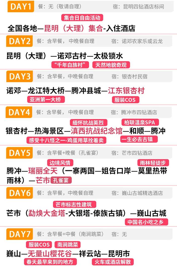 D7 | 第7天,巍山—无量山樱花谷(古装COS)—南涧跳菜—祥云站—昆明市(解散) | |