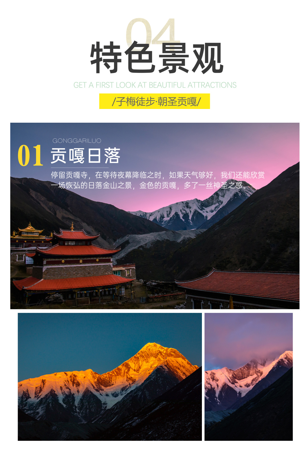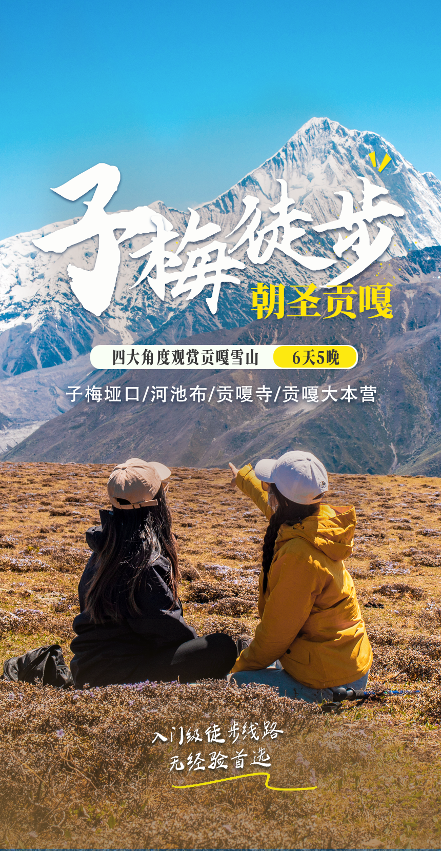 早上8点早餐后乘车大约40分钟到达子梅垭口,观赏到包括那玛峰等卫峰在内的贡嘎雪山全景。这里是拍摄贡嘎雪山全景的最佳位置,一路行行摄摄,移步换景,徒步3公里,一路下坡到达河池布。在这里观赏贡嘎雪山倒影,运气好,还可观赏到莫溪沟云海和佛光。 ![]() 每年5-7月份漫山遍野高山杜鹃,高原野花如炽尽态极妍,映衬圣洁雪山,分外娇艳。徒步于此,恍若世外仙境。上午徒步结束后乘车到达中子梅村,前往贡嘎寺,徒步6公里大约2个半小时到达,为大家准备了桌椅,可以在这里喝一个下午茶,观赏贡嘎雪山日落金山,还有贡嘎雪山的星空,晚餐为大家煮火锅。 温馨提示: 贡嘎寺海拔较高,交通不便,住宿条件有限,请大家提前做好心理准备。我们特意为大家准备了隔脏袋,因此产生的投诉,不予受理,敬请谅解。 |