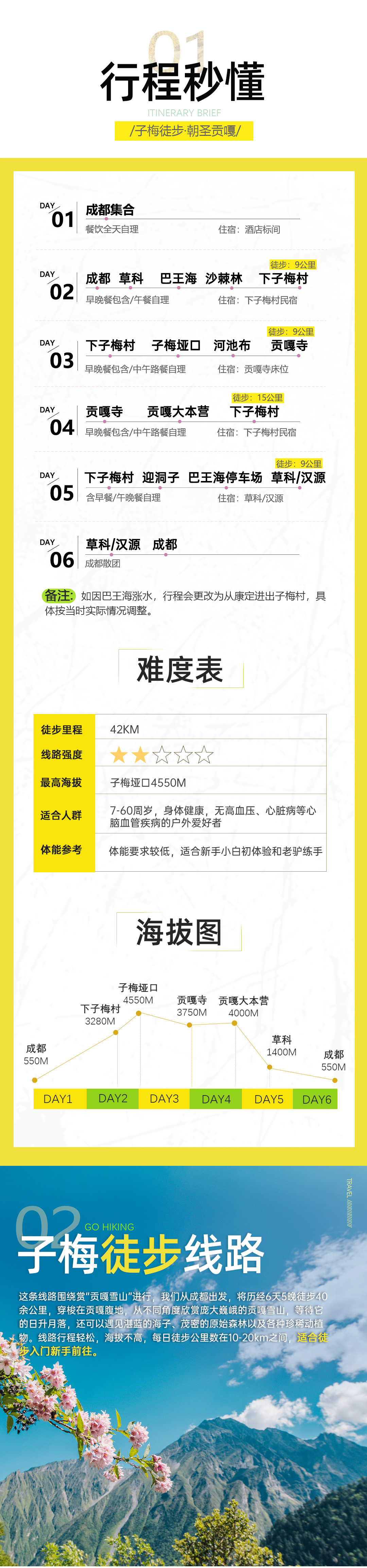咨询成团、余位 周五集合 2880元/人 单房差450元 线路纯玩,不安排购物点 金秋徒步节(仅此一期): 10月25日集合-10月30日散团 特惠:2580元/人!(赠送汉源火上飘烧烤) |