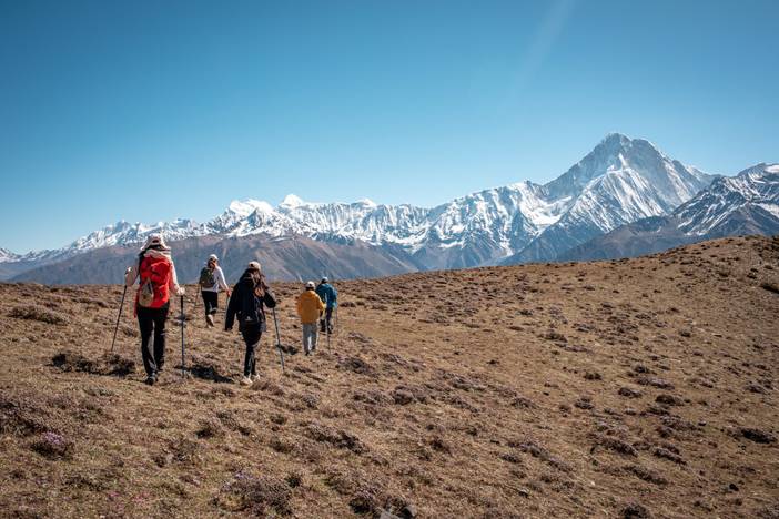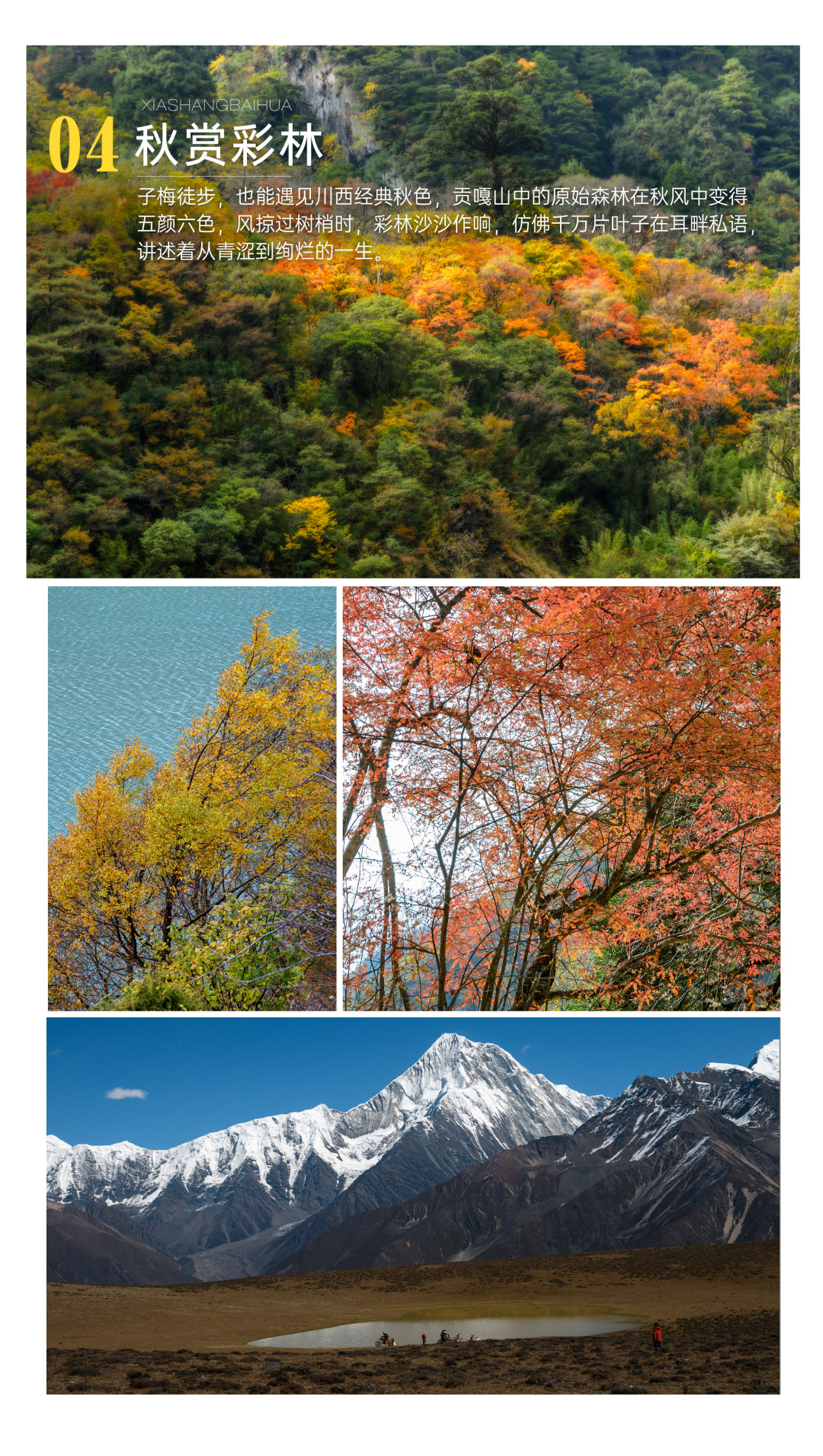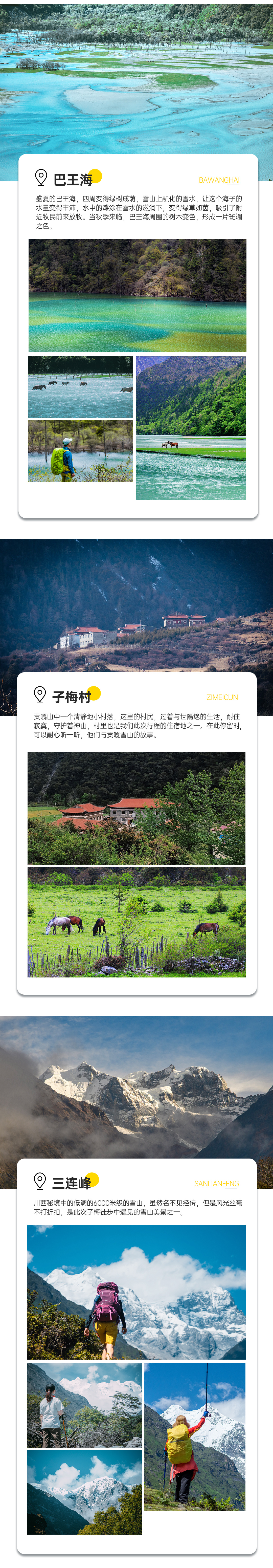 早上6点30酒店集合出发,乘车大约5小时,沿大渡河到达草科乡,午餐后乘车40分钟前往徒步起点(巴王海停车场)开始徒步,路过6000米级雪山三连峰,到达巴望海,穿过沙棘林,有中转车来接我们到达下子梅村入住,徒步9公里。 |