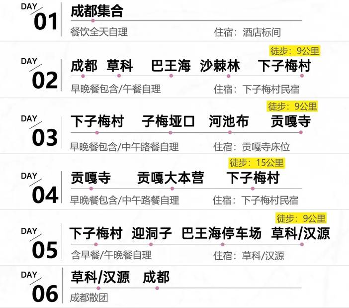 早上大家可以选择睡个懒觉午饭后乘车返回成都,到达成都后散团,结束徒步子梅的行程。 |