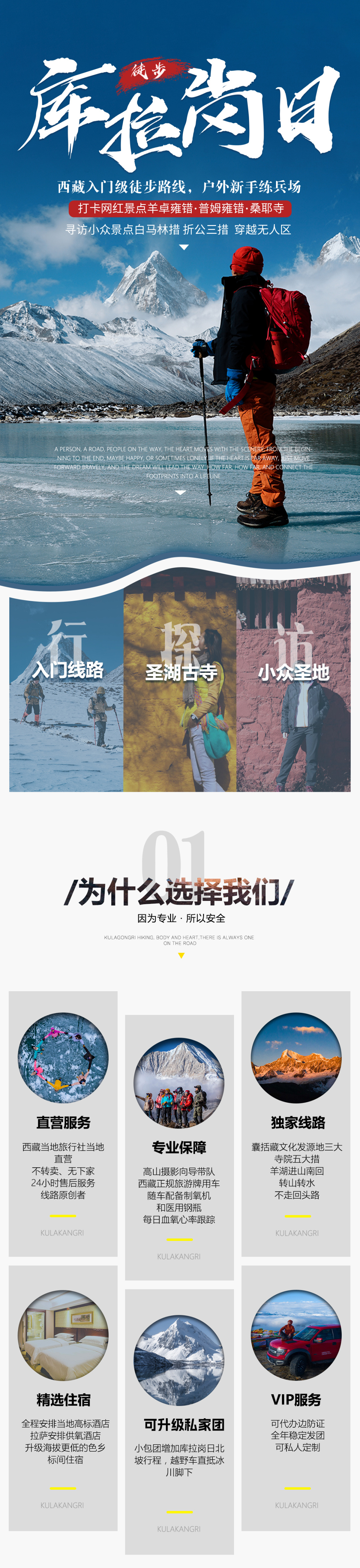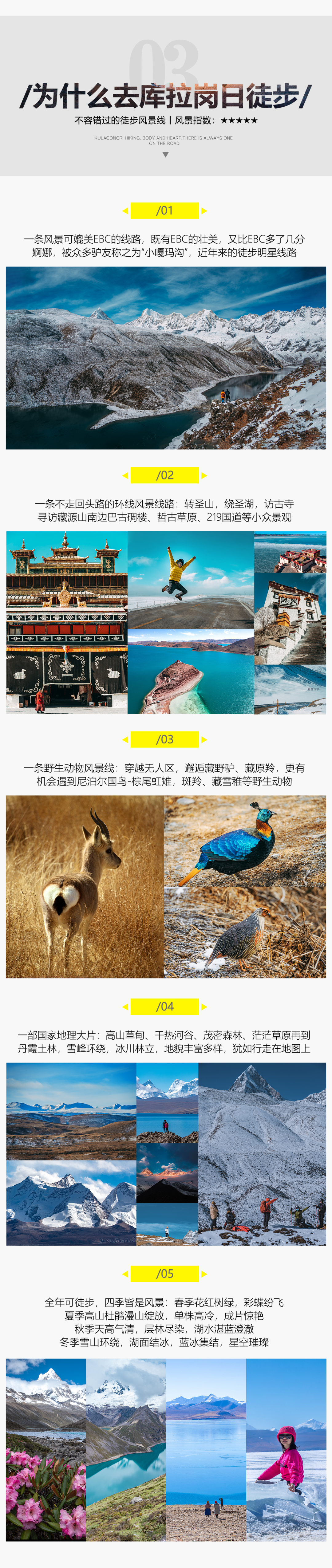 运动:本活动有一定运动量,不是单纯的旅游; 住宿:路上住宿条件不会像城市酒店那么好,很多徒步点住宿都很简陋; 餐饮:很多时候中午都需要吃路餐,意思是需要自备干粮,例如包装鸡腿、火腿肠、八宝粥、小蛋糕、牛肉干、巧克力、压缩饼干、水果青瓜等 着装:需要一双防滑的徒步鞋,不是跑鞋。袜子不能船袜,只能长筒的厚的袜子,多几双。了解什么是三层着装法(内层排汗+中层保暖+外层挡风雨) 高反:高原反应是不可预估的,无法知道谁有谁没有,要有心理准备。 如果你从来没有试过参加徒步团,可以试试一天的徒步活动,再参加长线。 |