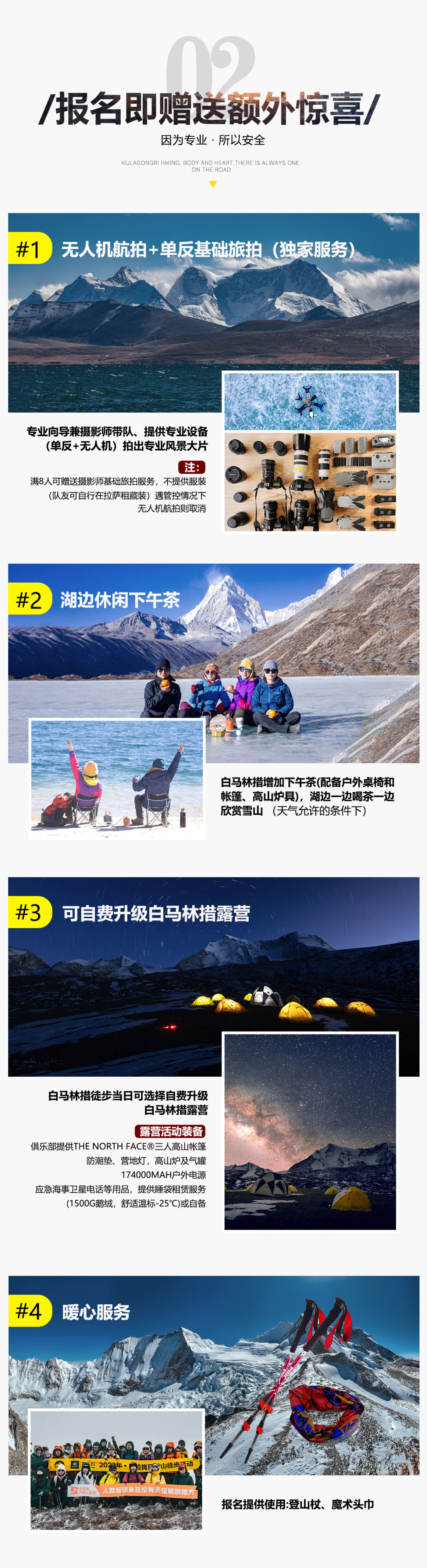 1、住宿:行程所列5晚标间住宿; 2、早餐:全程5个早餐; 3、交通:全程用车及司机费用; 4、门票:库拉岗日景区门票; 5、向导:专业户外向导全程带队; 6、随车携带高山应急氧气罐/制氧机; 7、每日血氧心率跟踪记录; 8、提供不少于2次当地水果; 9、保险:户外专项保险(70万)。 免费提供使用:登山杖使用 |