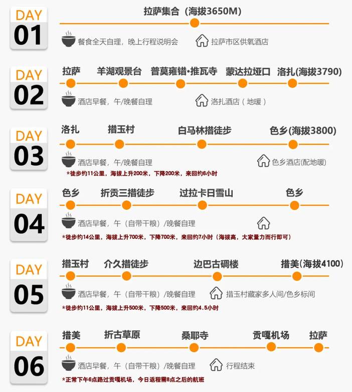 PS:注意不要剧烈运动,当天请尽量不要洗澡,可多吃蔬菜、水果、多喝水,不能饮酒。良好的心理素质是克服和战胜高原反应的灵丹妙药。保持豁达乐观的情绪,能够减弱高原反应带来的身体不适。一般过1-2天后,以上症状都会逐步减轻或消失。强烈建议,时间允许的情况下,可以提前一两天到达拉萨适应。特别需要注意的是,高反一般是在踏上高原后3-4小时左右开始出现,所以刚到拉萨时如果没有高反症状也切勿窃喜。 今天是集合日,向导会在圣城拉萨等待各位队员的到来。队员自行根据情况安排大交通到达拉萨,火车站距市区十公里,贡嘎机场距拉萨市区65公里。入住集合酒店后自行活动,当天尽量少运动,多休息,不饮酒。 晚上20:30集合,开行程说明会,由向导讲解本次活动注意事项,相互认识,为后面的行程做准备。 特别提醒: (1)集合日为自由活动,不是正式的行程,请在自由活动时注意人身财产安全,集合日不含保险; (2)建议队员们在集合日抵达拉萨后,可在市区采购一些旅行用品,如零食、佐餐小菜、药品等。 |
