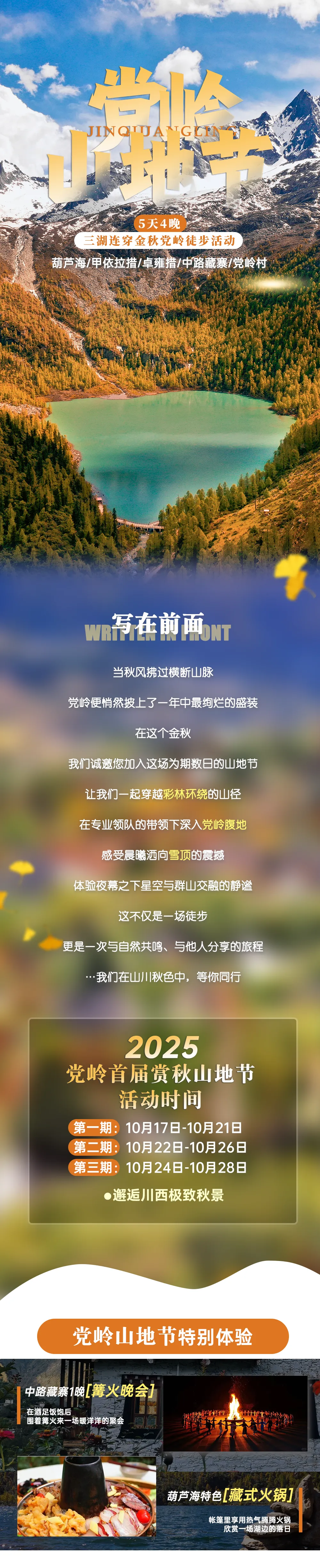 咨询成团、余位 特价大型活动,仅3期 第一期:10.17集合-10.21散团 第二期:10.22集合-10.26散团 第三期:10.24集合-10.28散团已满员 金秋价格:2180元/人 单房差580元 线路纯玩,不安排购物点 |