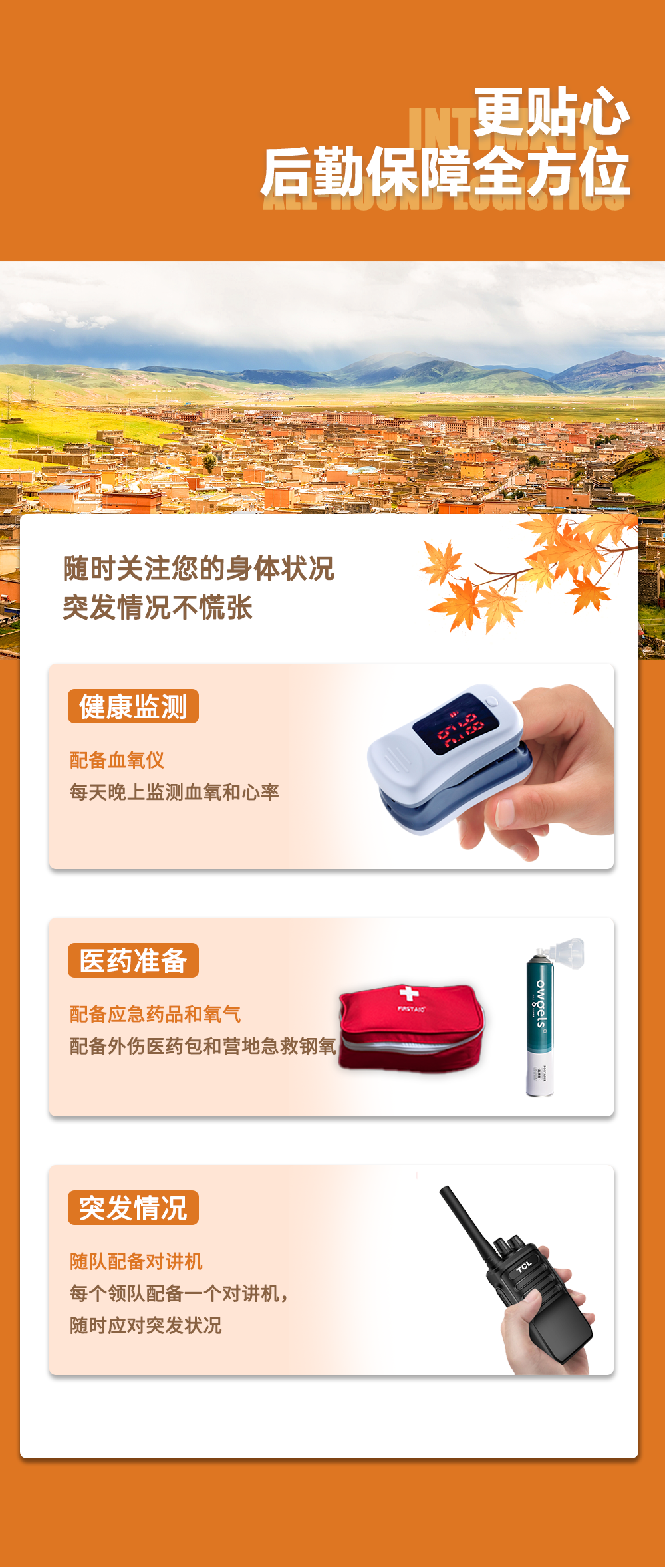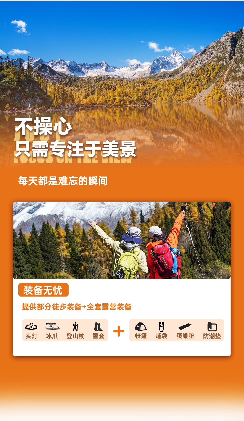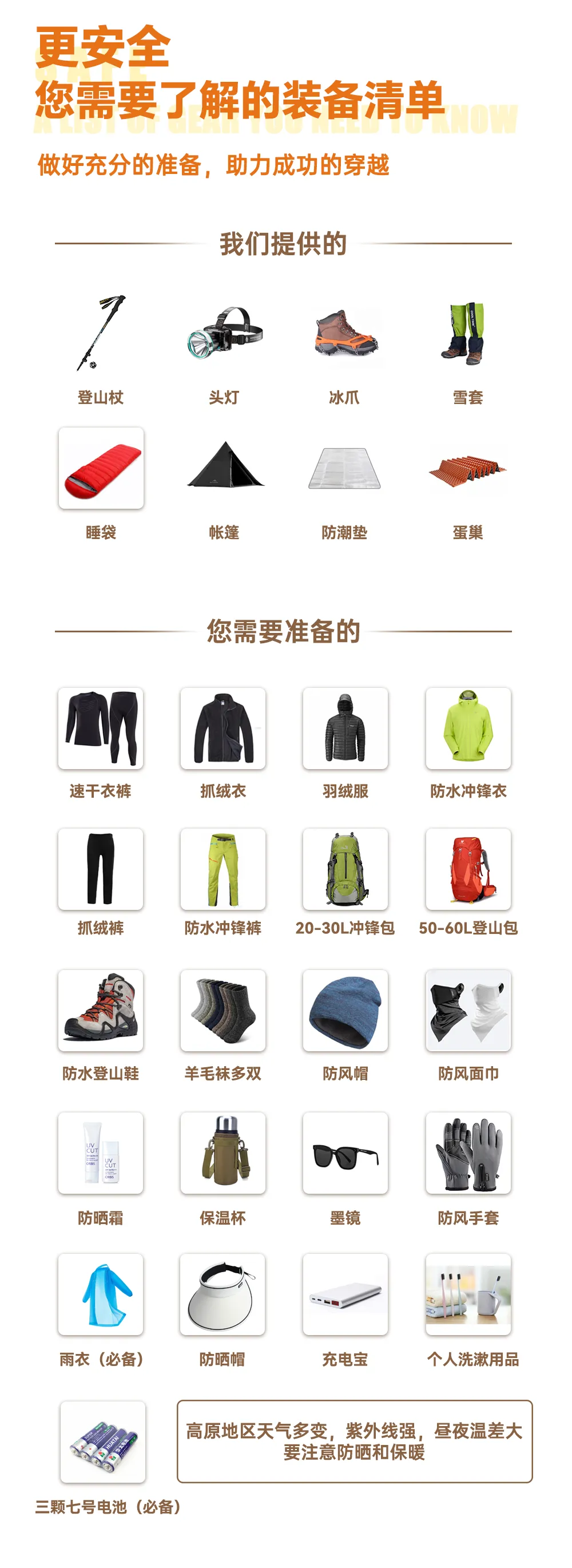 运动:本活动有一定运动量,不是单纯的旅游; 住宿:路上住宿条件不会像城市酒店那么好,很多徒步点住宿都很简陋; 餐饮:很多时候中午都需要吃路餐,意思是需要自备干粮,例如包装鸡腿、火腿肠、八宝粥、小蛋糕、牛肉干、巧克力、压缩饼干、水果青瓜等 着装:需要一双防滑的徒步鞋,不是跑鞋。袜子不能船袜,只能长筒的厚的袜子,多几双。了解什么是三层着装法(内层排汗+中层保暖+外层挡风雨) 高反:高原反应是不可预估的,无法知道谁有谁没有,要有心理准备。 如果你从来没有试过参加徒步团,可以试试一天的徒步活动,再参加长线。 |