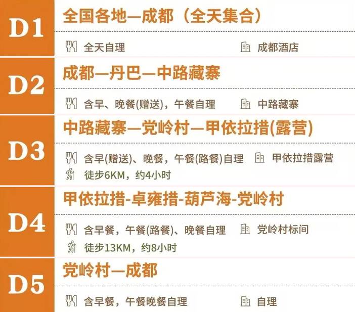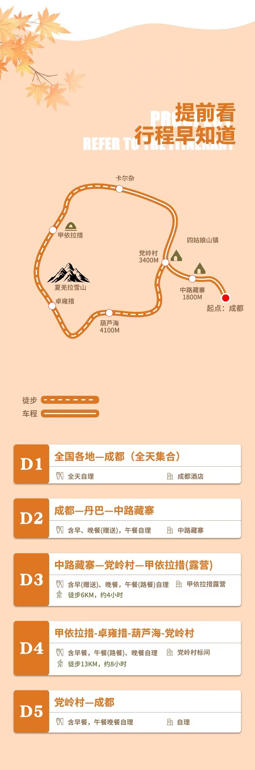全国各地的小伙伴抵达成都,入住我社为你安排的酒店。 今天是集合日,你可以放下行李后在酒店好好休息一下,也可以去品尝一下各种美食。 上午抵达成都的小伙伴,可以逛一逛成都的时尚中心【春熙路】和千年古刹【大慈寺】,打卡中西合璧的【太古里】和【IFS翻墙熊猫】。 下午抵达成都的小伙伴,可以去【锦里】和【宽窄巷子】, 感受最悠闲惬意的蓉城慢生活,或者是去打卡赵雷《成都》里的【小酒馆】。 特别提醒: (1)集合日为自由活动,不是正式的行程,请在自由活动时注意人身财产安全,集合日不含保险; (2)建议队员们在集合日抵达成都后,可在市区采购一些旅行用品,如零食、佐餐小菜、药品等。 (3)一般会在出发前2~3天建群并邀请进群。 |