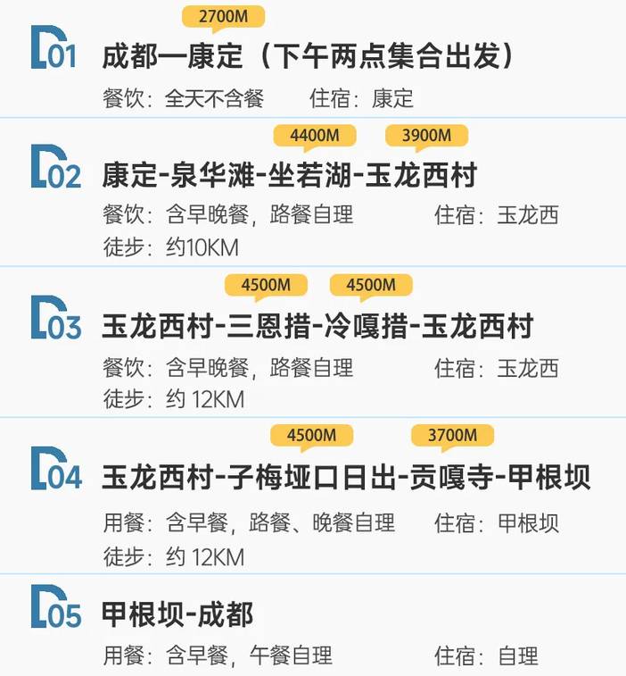 1、各地往返成都大交通; 2、行程中无包含的用餐及个人消费; 3、单房差:优先安排同性拼房,若拼房不成功安排和领队拼住或自己住(不收单房差); 4、行程中因个人原因所造成的额外费用支出,如高反离团交通等。 |