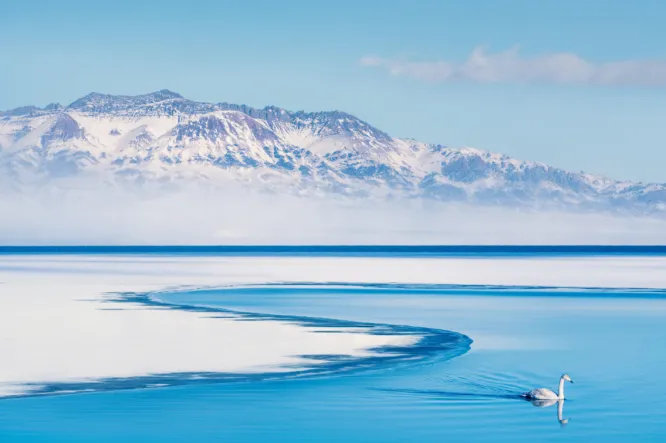 早起后正式游览赛里木湖,首先我们可以前往体验冰雪UTV,一起飞驰于蓝冰之上,感受冰雪中越野的狂野刺激。随后开始环湖,冬天,湖泊底部茂盛的水草产生的气泡,为冰泡景观的产生提供了基础。赛里木湖冬季十分寒冷,冰封期有时可以达到5个月之久,气温骤降之时,冰雪一夜就能覆盖湖面,冰泡层层叠叠,十分壮观。冰泡被封冻在湖面之下,阳光灿烂时,蓝色的湖泊好似一块掉落人间的蓝宝石。再加上四周环绕的群山,更是与蓝色的冰湖、白色的冰泡辉映,组成了一幅美丽的画面。此外,与新疆的其他湖泊相比,赛里木湖不仅海拔高,而且风特别大,有时可以达到8—9级。呼啸的狂风,能将堆积在湖面上的积雪快速地清理干净,并且还能将湖面打磨得更光滑,提高冰层的透明度,为冰泡的展示提供“舞台”。 之后适时返回精河入住。 温馨提示: 1.赛里木湖风大气温低,游玩时要带好防风大衣避免冻伤,携带好牛肉干巧克力等补充能量,另外在室外还请戴好墨镜以防发生雪盲。电子设备在低温下电量消耗快,请提前做好准备。 |