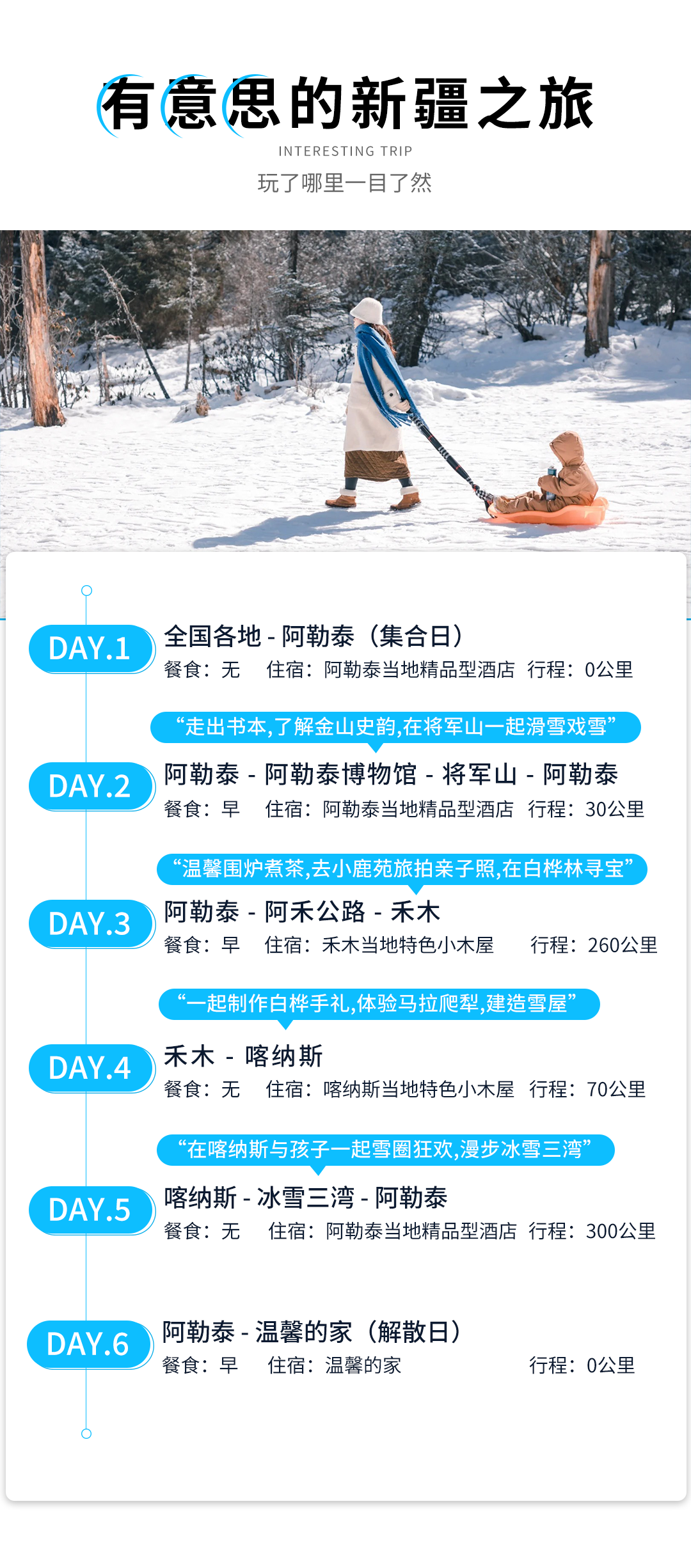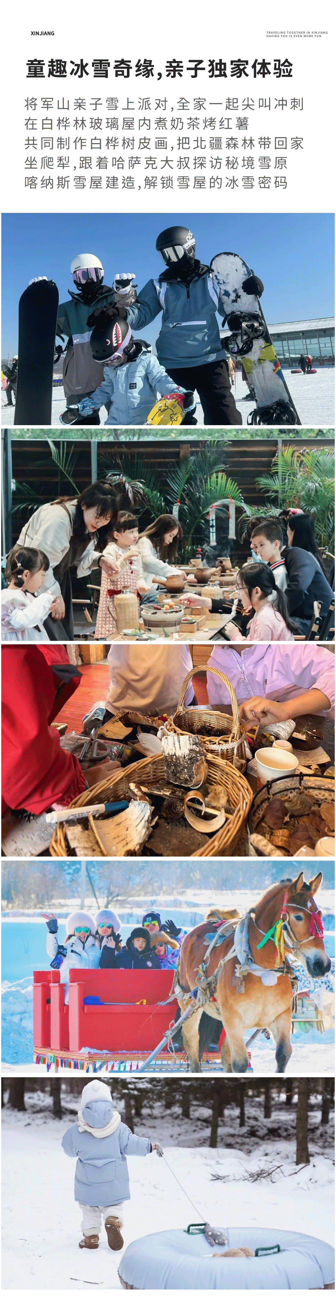早上起床后,前往阿勒泰博物馆。阿勒泰与蒙古,俄罗斯,哈萨克斯坦三国接壤,额尔齐斯河与阿尔泰山并成为“金山银水”,在这金山银水的风景里,矗立着一座棱角分明,宛如一块被风雨雕琢的巨石,这便是阿勒泰博物馆。今天在讲解员的带领下,我们可以了解到阿勒泰数千年的文明记忆,观赏展示游牧民族的草原石人雕塑,还可以欣赏到金山岩画,他向我们展现了人类滑雪的发源史。 用过中餐后,我们前往前往阿勒泰将军山滑雪场,在教练的带领下,大朋友和小朋友一起尽情享受5S级滑雪场带来的快乐,还可以一起玩雪圈,雪地摩托等多种雪地项目。等到阳光西下,粉雪披上了霞光,落日的余晖映照着滑雪道,构成了一幅美丽的画卷。参加派对的雪友们在DJ音乐的伴奏下带着欢笑尽情舞动,时而跳动着,时而欢呼着,仿佛在用最佳的方式迎接冬日的魅力。当夜幕降临,雪道两侧的灯光依次亮起,洁白的雪道与灯光交相辉映,一个个“全副武装”的滑雪爱好者从雪道飞驰而下,尽享速度与激情。让小朋友充分感受到滑雪运动带来的魅力。 温馨提示: 1. 新疆地域宽广,每天的行车时间比较长,,请提前做好准备哟。另外为了避免肚饿,可以自备一些小零食。 2. 新疆的冬天寒冷如常,请提前做好御寒准备。穿防风防寒衣服,携带帽子,围巾,手套,暖宝宝等御寒物品。 3.赠送的滑雪票为初级道含雪具,(不含防护用具如:头盔,手套,滑雪服等,滑雪场可自行租赁,也可自行携带),滑雪项目具有一定风险,请根据自身情况选择,无滑雪经验者及老人小孩建议请雪场教练带领(费用自理),不想滑雪者可以坐索道看日落及参加日落派对。 |