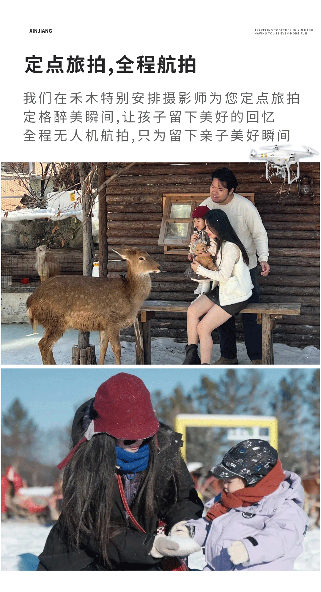 1.提供集合日24小时接送机服务,车上饮用水及水果/干果随车供应; 2.赠送无人机跟拍,禾木定点旅拍(不含妆造,每人9张简修照); 3.禾木马拉爬犁,围炉煮茶,雪地寻宝,雪屋建造工具 5.已经依法购买的旅行社责任保险+中国人寿国内游80万旅游意外险。 【赠送项目】不需要的也不退不换 |