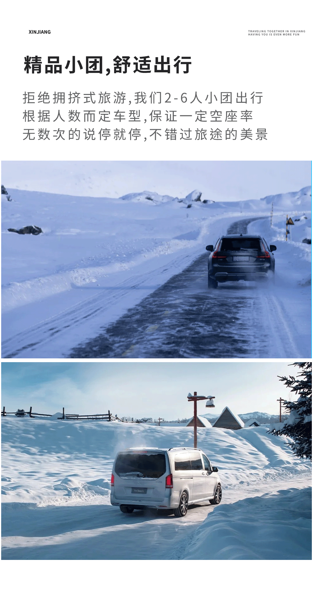 早起后我们前往阿禾公路,办理完边防证后出发,阿禾公路途经大小东沟、乌希里克湿地公园、托勒海特、伊列克石林、禾木等景区景点,串联起峡谷、森林、河流、湿地、雪山、草原、石林等多种自然景观,媲美独库! 之后前往景区入住山庄,即可开始享受禾木的冬天。冬季的禾木银装素裹,白雪皑皑,一片白雪与灰色白桦林的映衬,显得那么安静与反差。在这里体验围炉煮茶,看大雪满天,它又回归到本就属于这里的静谧和纯净。小朋友们还可以前往与小鹿来一个亲密互动,摄影师会为我们记录下美好的瞬间。 温馨提示: 1.阿禾公路将采取分时段、分区域通行模式(起点小东沟检查站(K0)上午11时30分开始放行,15时30分停止进车;野卡峡(K68)至禾木段(K209)通行时间为16时前至19时,16时后野卡峡检查站不再放行,阿禾检查站19时封闭)。如遇极端天气和自然灾害,交管部门将实施临时道路管控措施。届时将绕行国道前往禾木。 3.赠送项目顺序可能根据行程进行微调,请听从领队安排 |