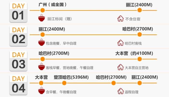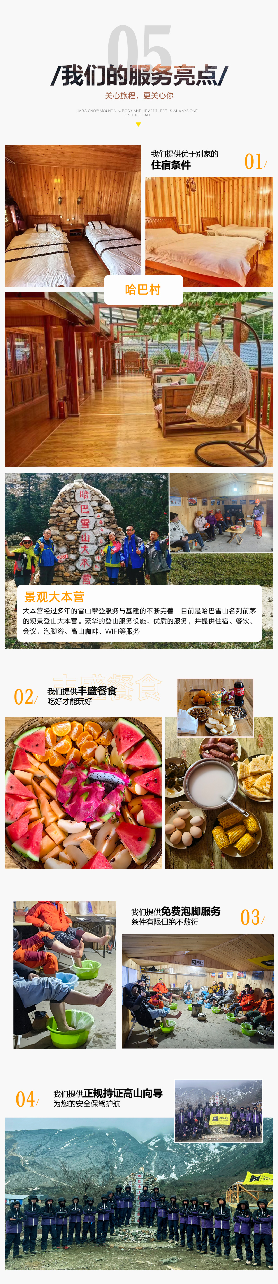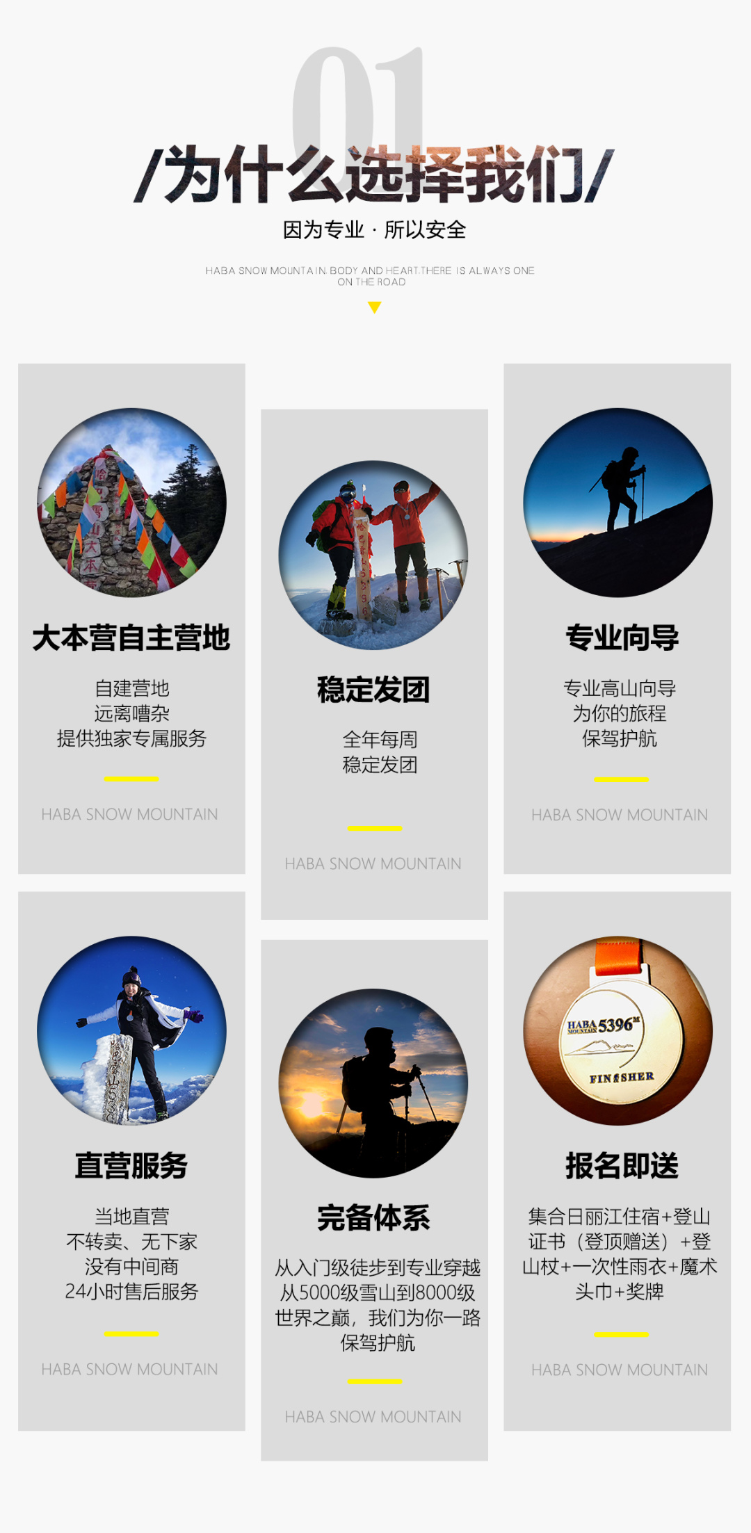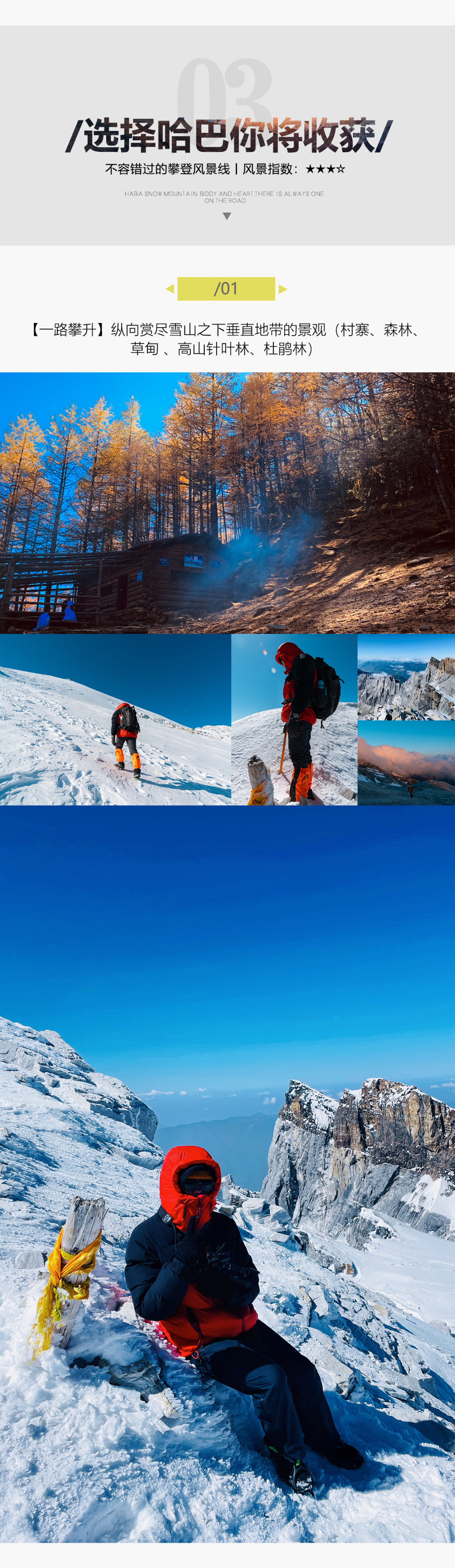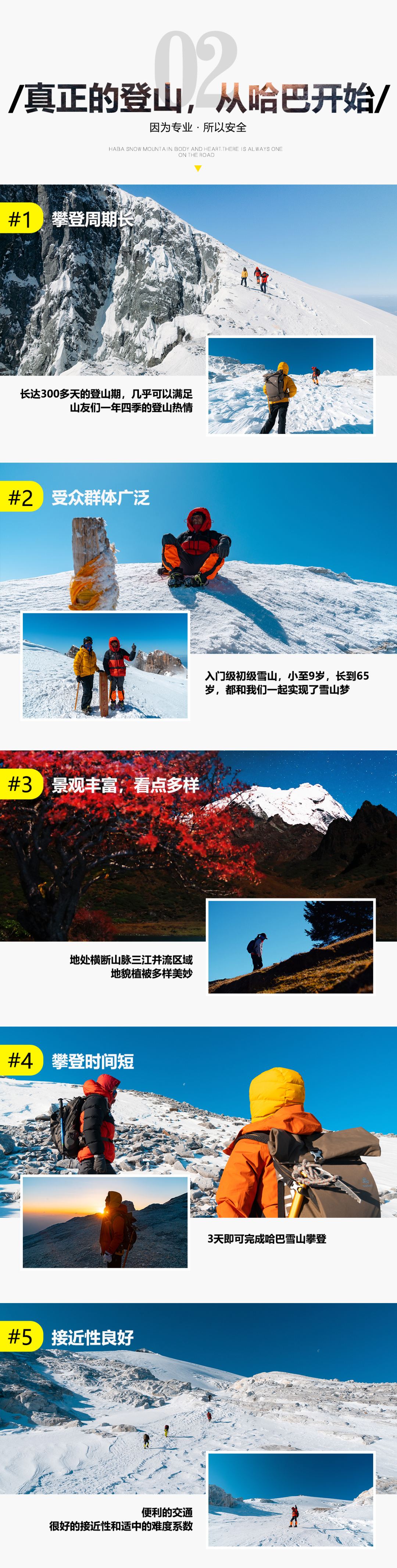 5、丰富选择:哈巴雪山有常规的4天丽江集散攀登,也有3天哈巴村集散速登版,适合更多户外爱好者参与;