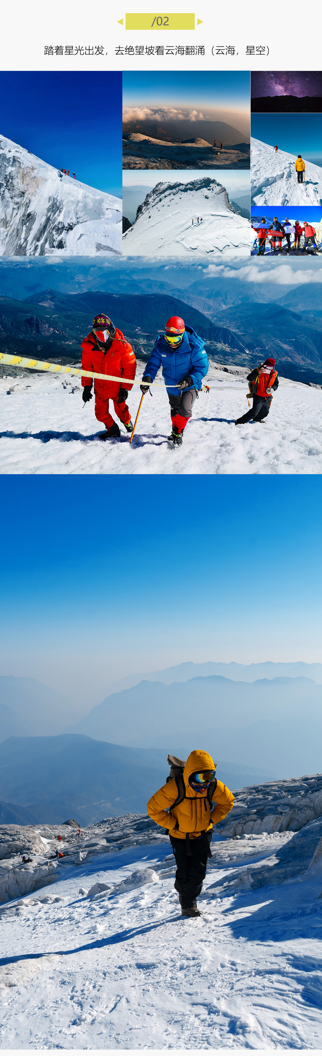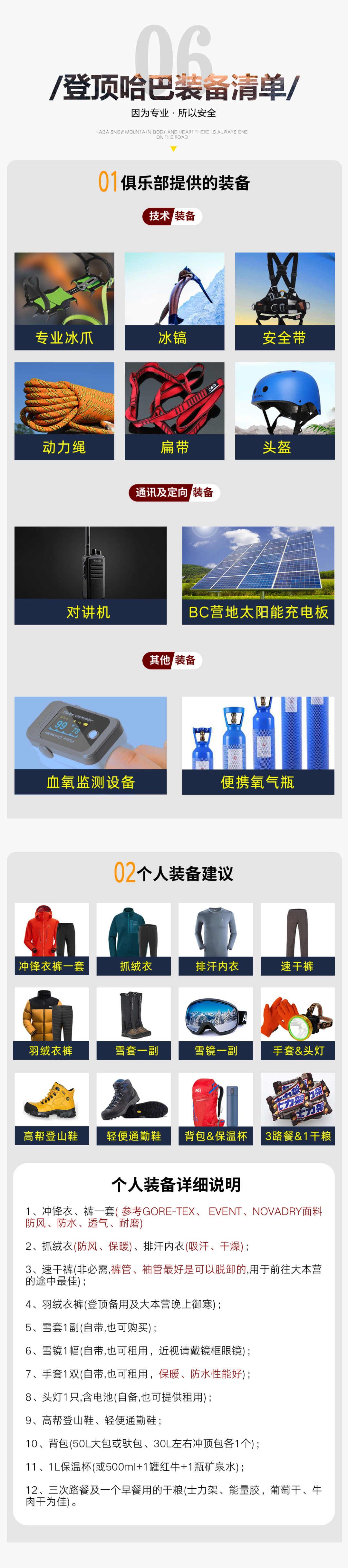 2、安全保障:自主协作队常年开展登山服务,长期一线工作实践,涉及5000+、6000+、7000+雪山攀登业务,高配比协作加多向导带队,包含高额高山意外保险;