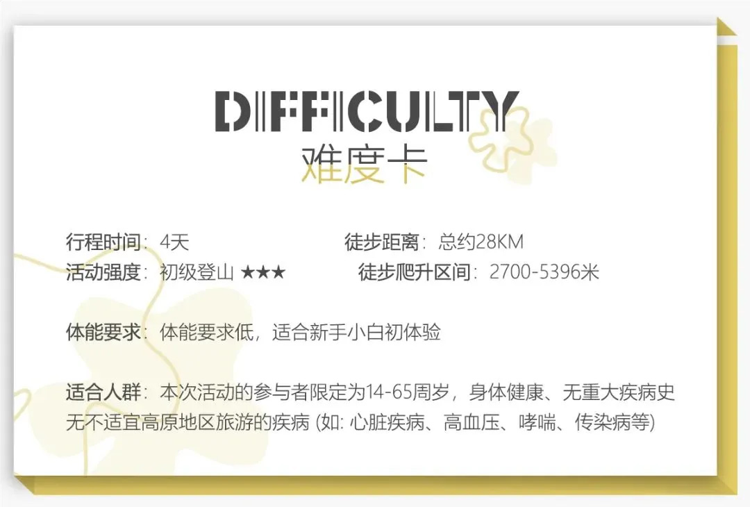 运动:本活动有一定运动量,不是单纯的旅游; 住宿:路上住宿条件不会像城市酒店那么好,很多徒步点住宿都很简陋; 餐饮:很多时候中午都需要吃路餐,意思是需要自备干粮,例如包装鸡腿、火腿肠、八宝粥、小蛋糕、牛肉干、巧克力、压缩饼干、水果青瓜等 着装:需要一双防滑的徒步鞋,不是跑鞋。袜子不能船袜,只能长筒的厚的袜子,多几双。了解什么是三层着装法(内层排汗+中层保暖+外层挡风雨) 高反:高原反应是不可预估的,无法知道谁有谁没有,要有心理准备。 如果你从来没有试过参加徒步团,可以试试一天的徒步活动,再参加长线。 |