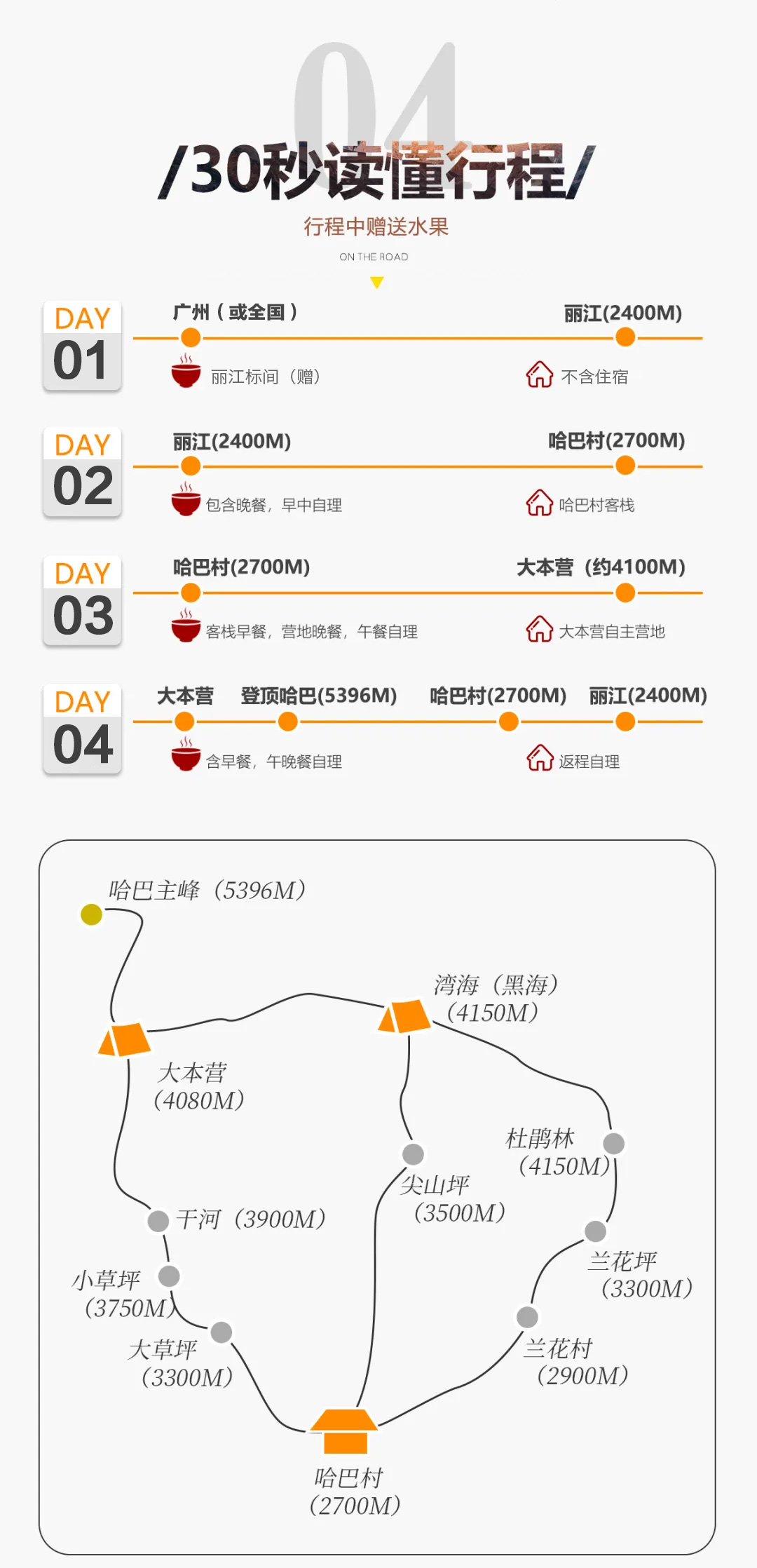 D4 | 第4天,大本营 - 冲顶 - 大本营 - 哈巴村 -丽江 | |