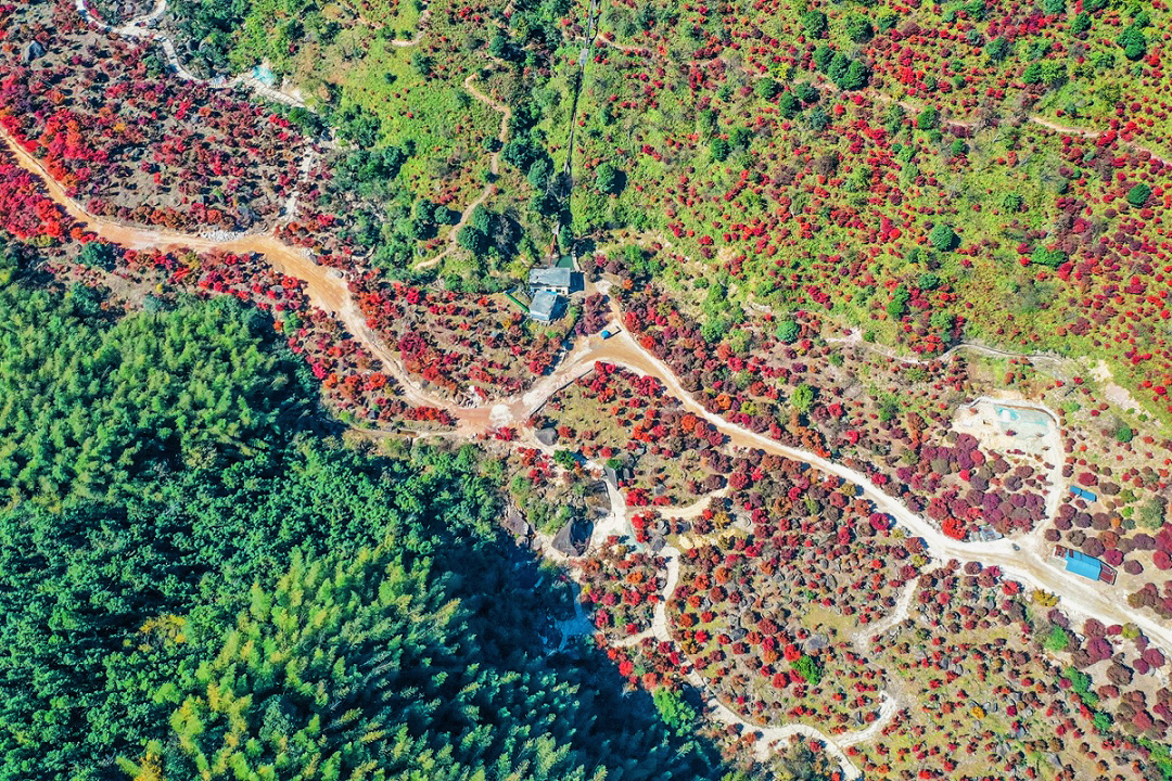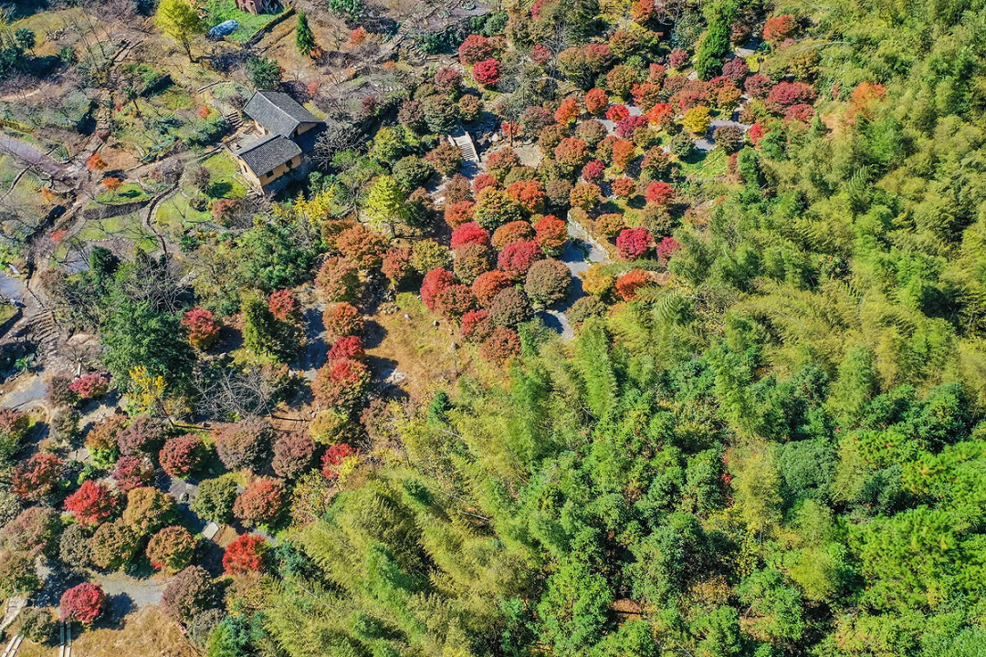 从高空俯瞰,火红的枫叶与竹林山色构成了一幅秋日“枫”景画卷。