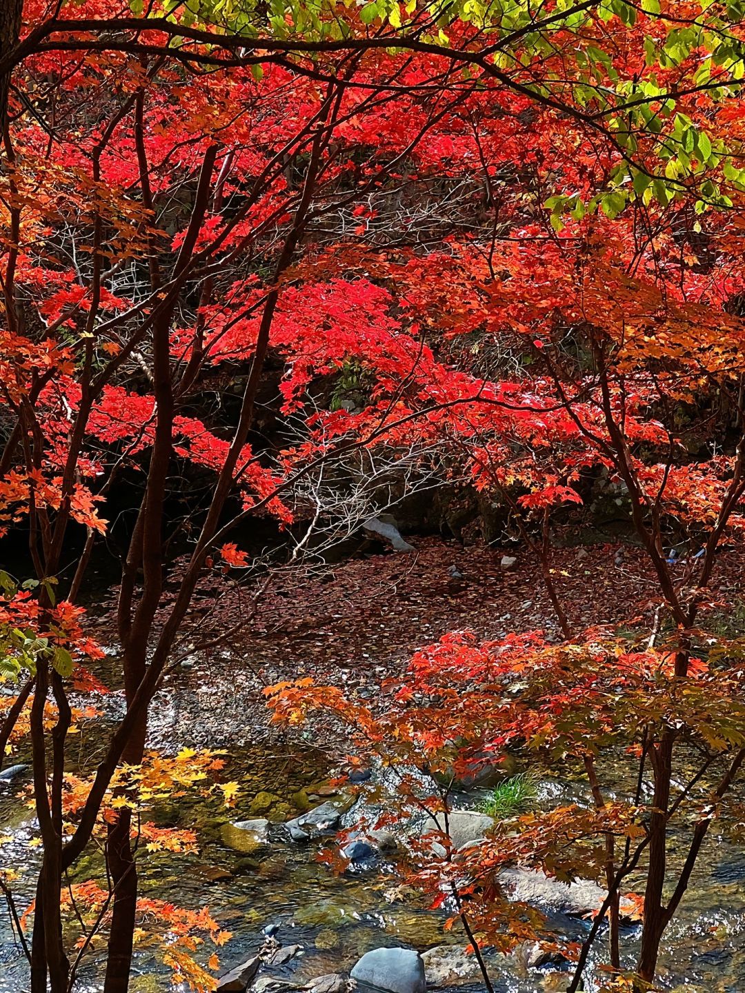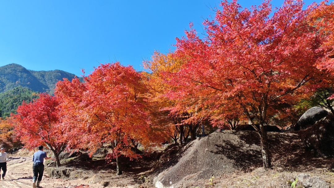| 换成接驳车进入景区,抵达景区后跟随领队一起去赏枫,抬眼望去,层层叠叠的枫叶红得浓烈,红得似火,染红了山谷,染红了山涧,就像一条鲜红的地毯铺在蜿蜒曲折的山谷中,美轮美奂,美不胜收 (当地有少量农庄,最好带上干粮)。 | ||