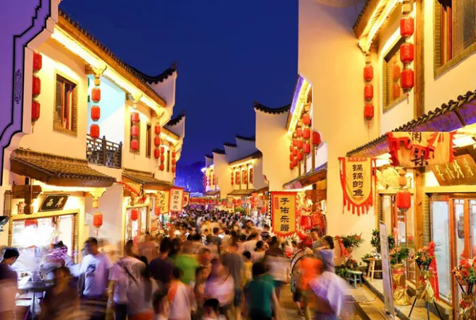 华灯初上,灯笼高挂,布幌摇曳,屋黛瓦青的街巷热闹非凡。