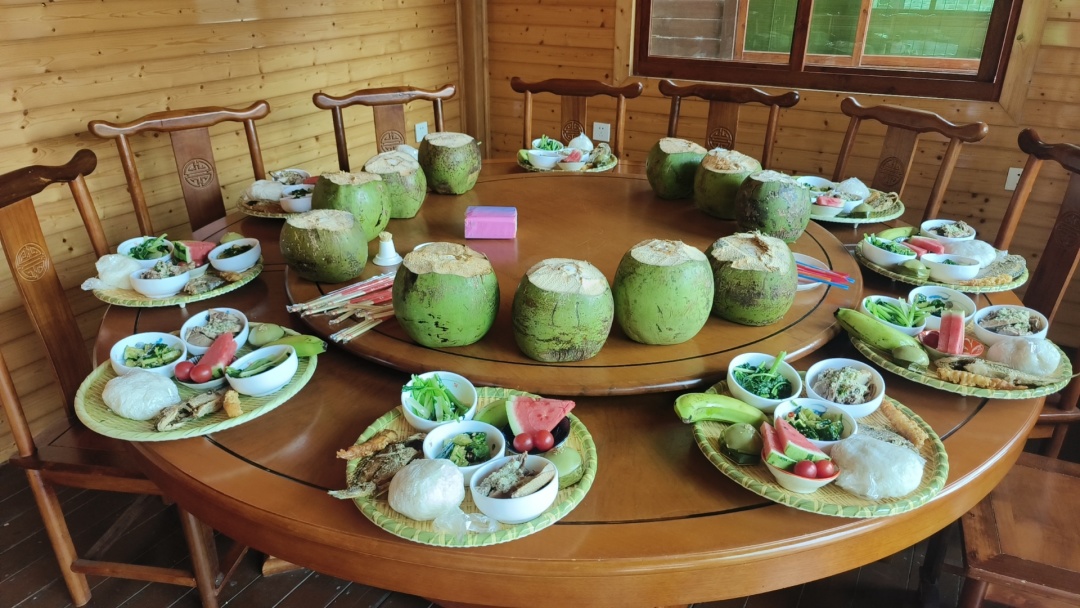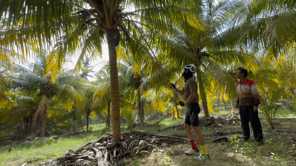 一场充满野趣独特体验等待我们,在专业指导和安全保护下,我们学习如何使用长杆镰刀或他工具割下椰果,并享用亲手采摘的新鲜椰汁。