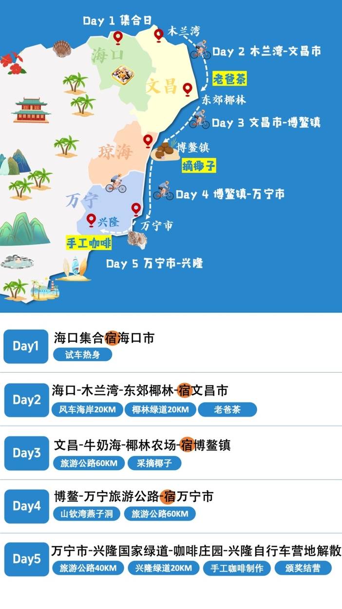 风车海岸20KM+椰林绿道20KM 今天特别安排:老爸茶体验 7:00起床 7:20酒店餐厅用早餐 8:00 集合装行李(检查好个人物品,行李收拾好,房卡记得交到前台哦) 8:10坐车转场到文昌木兰湾(约60分钟车程) 9:10骑行热身 9:30开始骑行木兰湾 12:00用午餐 12:40乘车前往文昌东郊椰林 14:00骑行文昌椰林小路 大家自由安排晚餐 今日行程结束 |