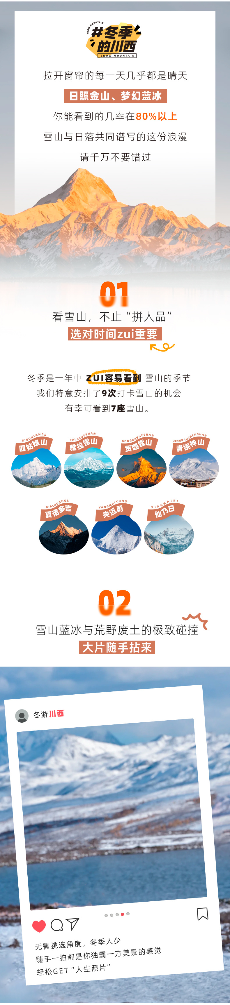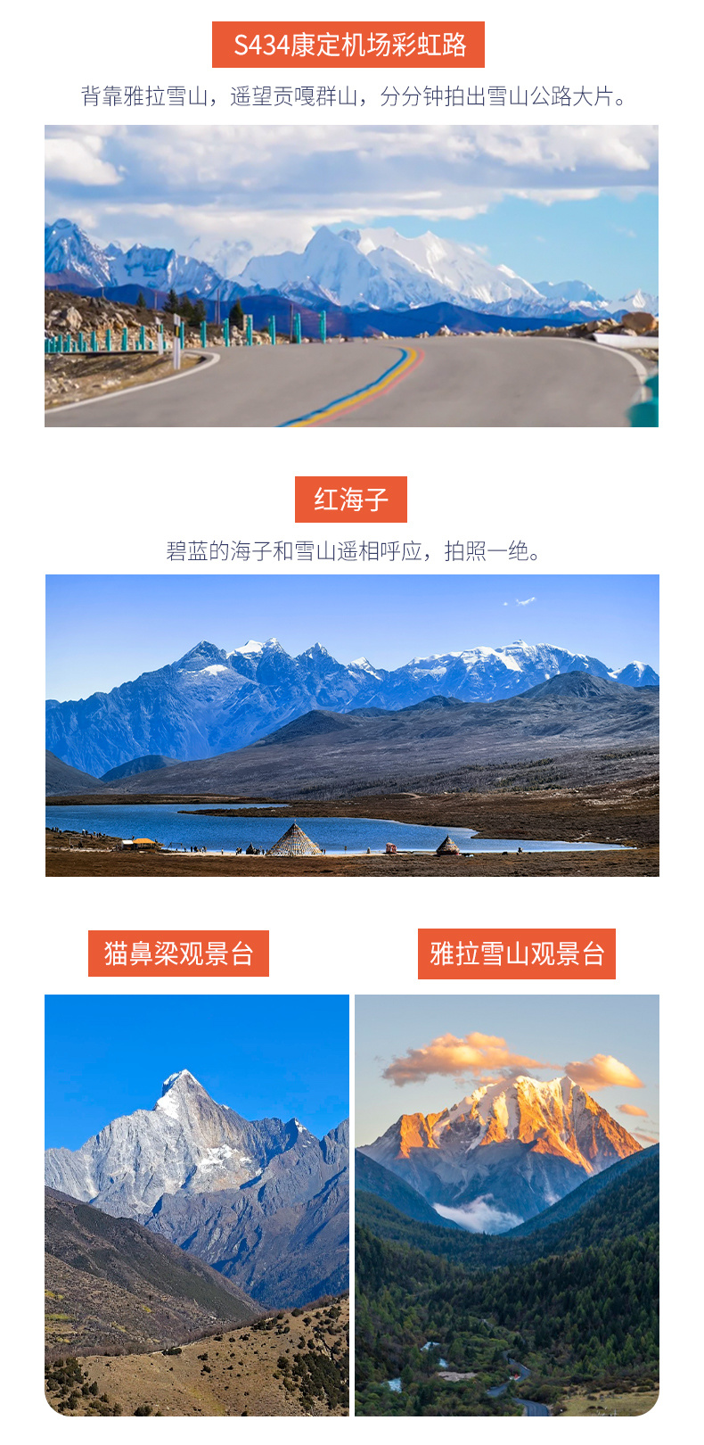 【行程概述】 早餐后出发,途中会经过各大旅行博主的拍照圣地【康定机场彩虹公路】,这里背靠雅拉雪山,遥望贡嘎群山,分分钟拍出雪山公路大片,惊艳朋友圈。 而后抵达一处秘境海子--【红海子(加呷腊)】,这里可以包揽整个湖泊和雪山。晴天,可以看到笔架山(5880M)、田海子峰(6080M)等一众雪山,拍照更是一绝,海子和雪山遥相呼应,怎么拍都好看。 游玩后我们朝着甘孜藏族自治州首府——《康定情歌》中的康定行进,随后上【雅康高速】,穿越二郎山隧道,感受阴阳两重天,经雨城雅安上成雅高速返回成都。 特别提醒: (1)以上行程时间安排可能会因天气、路况等原因做相应调整,正常情况下完团回到成都时间为晚上18:00-19:00,如果必须当日离开,请定22:00以后的回程大交通,以免耽误行程,敬请谅解; (2)以上行程及时间仅供参考,具体以实际出发行程及时间为准,在不减少景点的情况下,我公司有权调整行程游览的先后顺序。 |