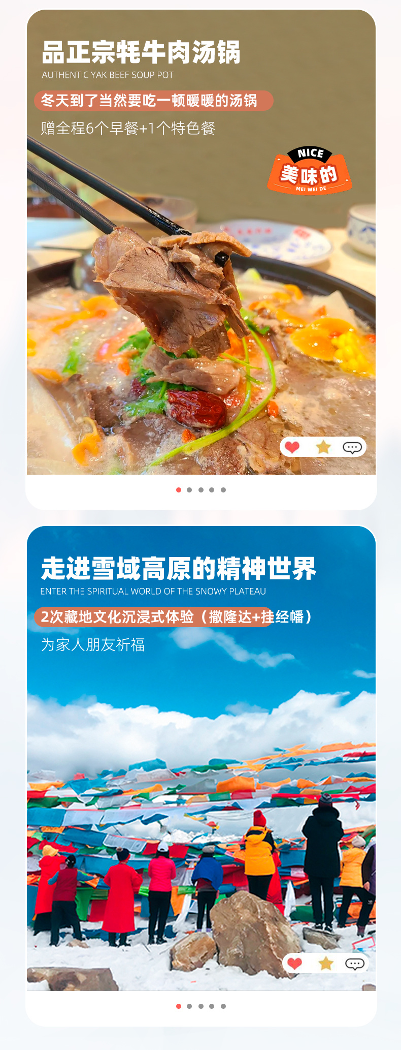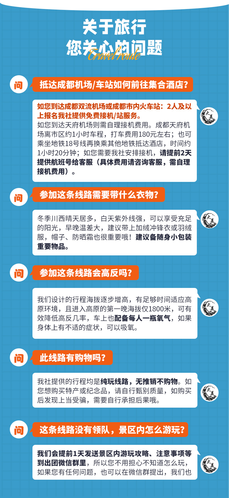 1、驻地藏式旅拍1次(免费提供藏装/首饰,赠3张电子版简修,底片全送); 2、挂经幡、撒隆达体验; 3、全程6个早餐+1个特色餐(牦牛肉汤锅),如队员另外点餐,需自己支付费用; 4、颈枕+两件式套装雨披+瓶装氧气,每人一套; 5、最高保额为80万元的旅游意外险(不含财产险),中国银保监会规定:对于71周岁以上(含71周岁)的被保险人,保额减半,保费不变;不满10周岁80万的额度下降至20万,已满10周岁但未满18周岁80万的额度下降至50万; 注:旅行社赠送一份旅游意外保险,如发生意外事件,该意外保险理赔的金额优先抵扣旅行社可能承担的赔偿金额。港澳台及外籍人士,仅限大陆三甲医院就医才可报销,如离开大陆就医不予报销。 6、2人及以上报名赠双流机场接机/成都市内火车站接站(天府机场接机需自理费用)。 注:接机/站请提前2天告知航班号/车次,否则视为放弃此服务;赠送项目如客人自愿放弃或因特殊原因及不可抗力等原因无法参加,均不退费用,也不等价交换。 |