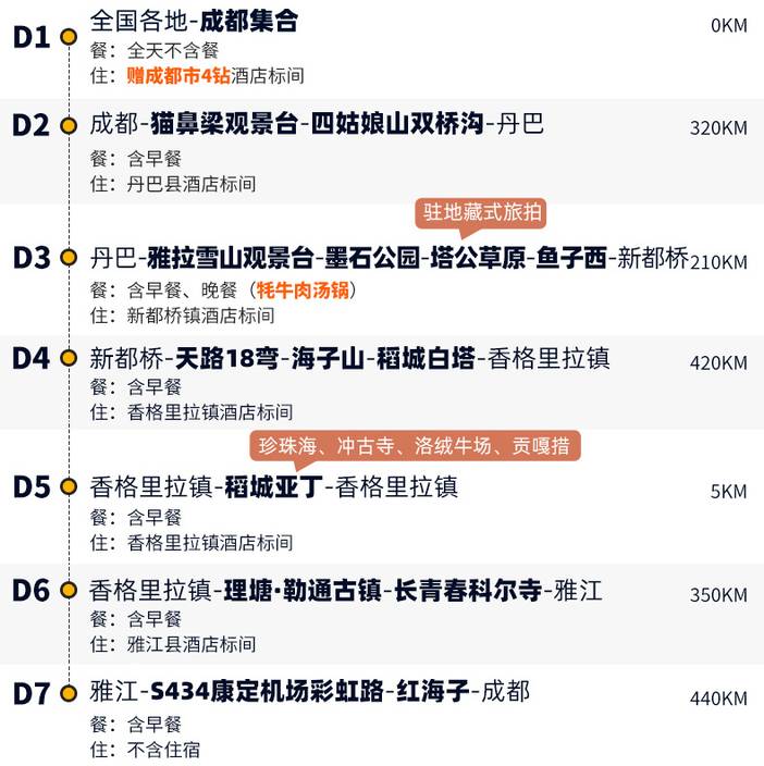 1、交通:10人纯玩小团,根据人数确定车辆(全程司机兼向导,已含驾驶员食宿、油费、过路费,驾驶员熟悉线路,会给队员提供行程建议,边走边玩,保证多次停车服务,但不会像专业导游一样解说,且不陪同队员进景区,请理解); 2-3位队员乘坐5座SUV/越野; 4-8位队员乘坐7-9座商务车; 9-10位队员乘坐12-17座江铃考斯特; 2、住宿:全程6晚地暖/空调标间住宿(含集合日1晚赠送4钻酒店、不住不退); 3、门票:稻城亚丁门票、墨石公园门票、勒通古镇门票及观光车、四姑娘山双桥沟门票; 4、随团配备:急救包+血氧仪+温度计,随时观察了解客人的身体状况。 |