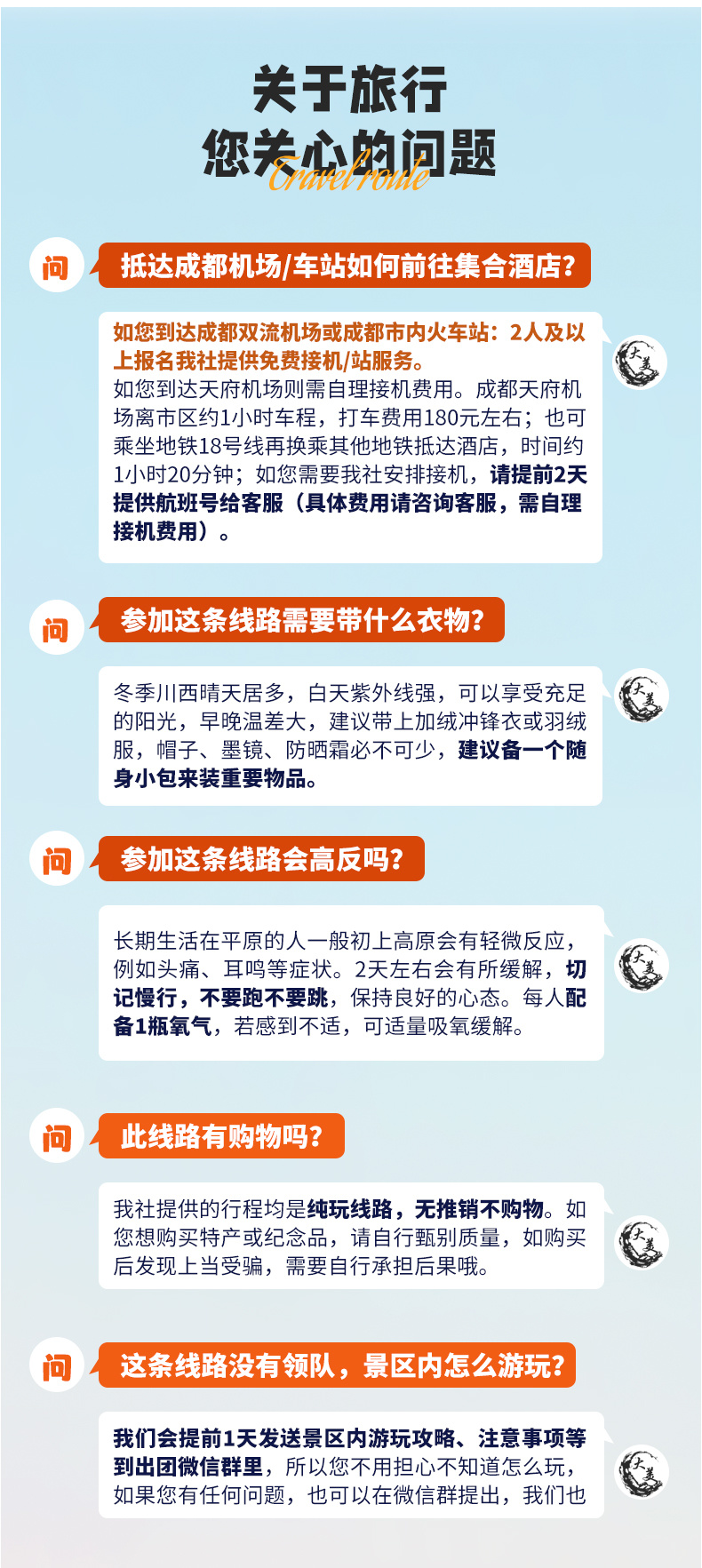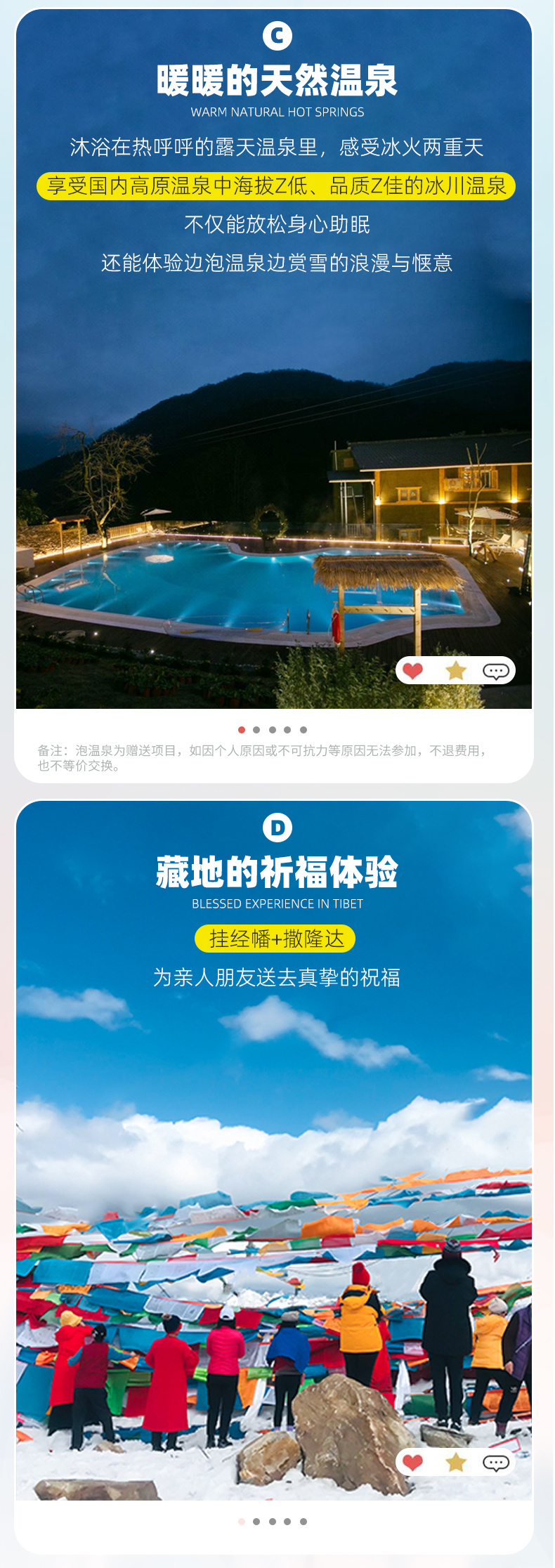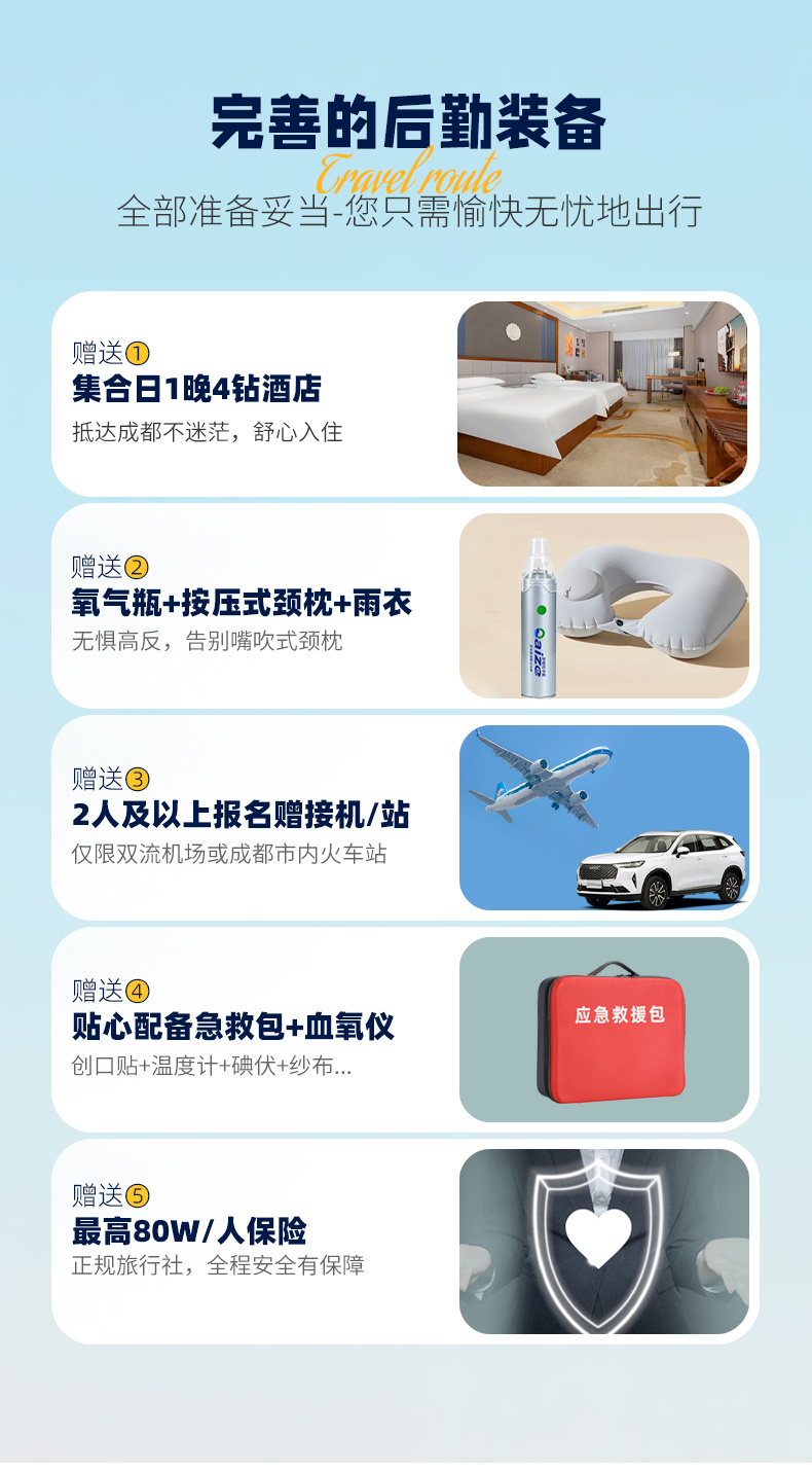 1、沐浴天然温泉; 2、挂经幡、撒隆达体验; 3、驻地藏式旅拍1次(免费提供藏装/首饰,赠3张电子版简修,底片全送); 4、全程4个早餐+1个特色餐(牦牛肉汤锅),如队员另外点餐,需自己支付费用; 5、颈枕+两件式套装雨披+瓶装氧气,每人一套。 6、最高保额为80万元的旅游意外险(不含财产险),中国银保监会规定:对于71周岁以上(含71周岁)的被保险人,保额减半,保费不变;不满10周岁80万的额度下降至20万,已满10周岁但未满18周岁80万的额度下降至50万; 注:旅行社赠送一份旅游意外保险,如发生意外事件,该意外保险理赔的金额优先抵扣旅行社可能承担的赔偿金额。港澳台及外籍人士,仅限大陆三甲医院就医才可报销,如离开大陆就医不予报销。 7、2人及以上报名赠双流机场接机/成都市内火车站接站(天府机场接机需自理费用); 注:接机/站请提前2天告知航班号/车次,否则视为放弃此服务;赠送项目如客人自愿放弃或因特殊原因及不可抗力等原因无法参加,均不退费用,也不等价交换。 |