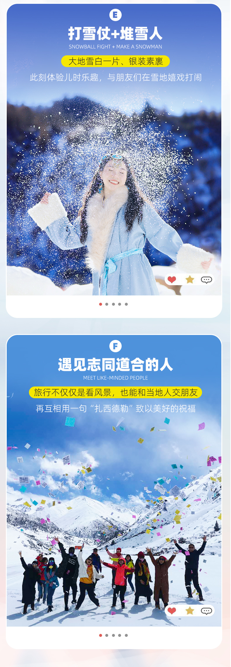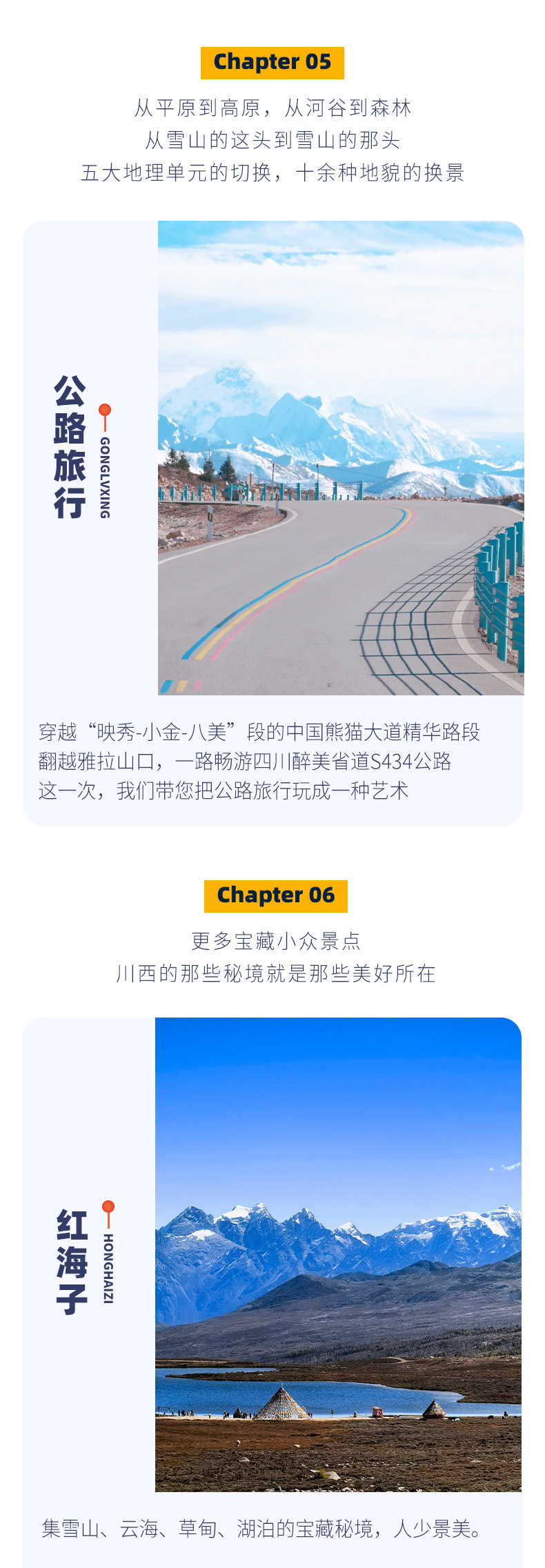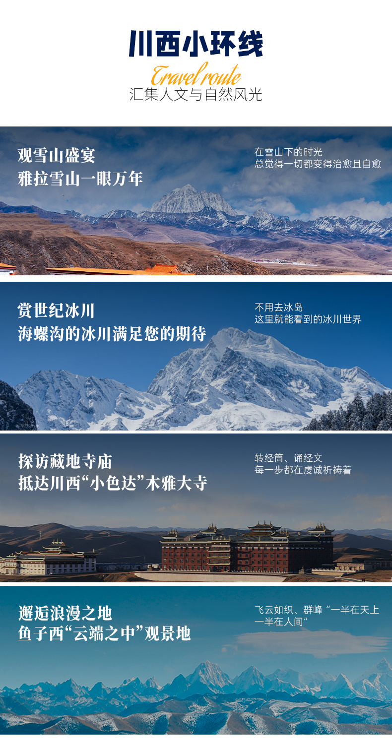 【行程概述】 早餐后出发,离开磨西古镇,沿着【大渡河】逆流而上,来到著名的【泸定桥】(自愿参观,上桥保险5元/人自理),这是一座曾经决定了中国近、现代历史进程的古桥,参观后,您会感受到中国历史的沉重与辉煌。 继续行车,沿途经过《康定情歌》的故乡-康定市,之后便抵达一处秘境海子——【红海子(加呷腊)】,这里可以包揽整个湖泊和雪山。 晴天,可以看到笔架山(5880M)、田海子峰(6080M)等一众雪山,拍照更是一绝,海子和雪山遥相呼应,怎么拍都好看。 沿途这条绝美的S434,人少景美,一路都是惊喜,蓝天、雪山、海子尽收眼底,其中各大旅行博主的拍照圣地——【康定机场彩虹公路】不要错过啦,这里背靠雅拉雪山,遥望贡嘎群山,分分钟拍出雪山公路大片,惊艳朋友圈。 拍照打卡结束后,行车约1小时便可抵达这个近年来非常火爆的360°天然雪山观景台——【鱼子西(曲莫贡)】,天气好时,可以同时看见【雅拉雪山】、【贡嘎群山】、【四姑娘山】全貌,在这里随手一拍,皆是大片! 山顶的秋千、露营的帐篷更是网红拍照打卡地。 游玩结束后今晚前往新都桥镇入住,放好行李后,前往餐厅品尝当地特色餐-【牦牛肉汤锅】,美味又饱腹,最适合冬季时节来一顿啦! 特别提醒: 如遇鱼子西景点关闭,无法游览,我们将更换为格底拉姆/八郎生都,请知悉!如因天气、交通管制、堵车等原因,赶不上鱼子西的日落,敬请见谅。 |