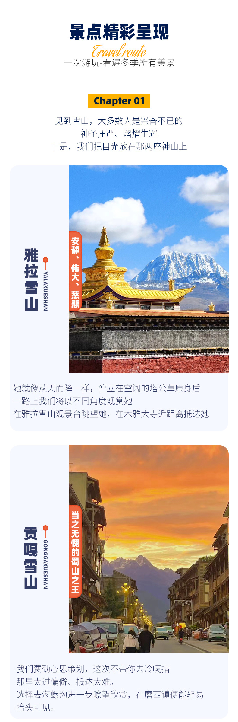 【行程概述】 早餐后从新都桥出发,来到塔公草原,这里可以观赏和拍摄木雅金塔和雅拉雪山的同框大片,如果你不会拍人像照片,不用担心,咱们安排了当地的旅拍团队,穿上藏装,听摄影师指挥,轻轻松松出美照!拍摄后前往【木雅大寺】,它坐落于【塔公草原】深处的一个小村落——各日马村,背靠雅拉雪山,海拔3500米,很少被游客所叨扰。木雅大寺是由觉母庙、喇嘛寺、佛学院和藏医院等组成的寺庙群,远远望去,仿若另一个“色达”。 在这里你还可以买上一块或者几块刻着真言的经文石堆在经文墙上,每天虔诚的信徒都会绕着经文石堆起的经文墙转经,每转一圈就相当于把你的愿望祝福一遍。还有那近在眼前的雅拉雪山、绛红色的寺庙、闲庭漫步的小鹿都是你不可错过的惊喜。 而后继续行车,抵达川西异域星球——【墨石公园】,“春赏格桑夏避暑,秋观彩林冬踏雪”,冬日的墨石公园,白雪的柔情与墨石的刚硬幻化出一道别样的奇景。你可以先从高处俯瞰墨石全景,然后慢慢往下走,沿着栈道深入墨石区域的内部,和墨石来个近距离接触,栈道旁就是高耸的墨石,非常炫酷,是拍摄人像的绝佳站位! 沿着中国熊猫大道继续前行,随后翻疙瘩梁子,站在【雅拉雪山观景台】上远观洁白壮丽的雅拉雪山,也可以面对雪山撒下隆达,为家人亲友送去美好的祝愿。 打卡完后我们穿行在被誉为“天然盆景”的丹巴【牦牛谷】,峡谷两旁陡峭险峻,河水哗啦啦在流淌,沿着一路的峡谷风光前往四姑娘山镇入住。 特别提醒: (1)旅拍为赠送项目,如因天气原因或自身原因导致不能拍摄,不退费用,敬请谅解; (2)原则上旅行社不推销也不推荐升级旅拍套餐,如您自费升级其他套餐,请自行与工作室协商,所产生的费用也由您亲自支付给摄影工作室,如对自费旅拍套餐不满意(包括拍照时间不够、成片不理想等),我社不接受投诉! |