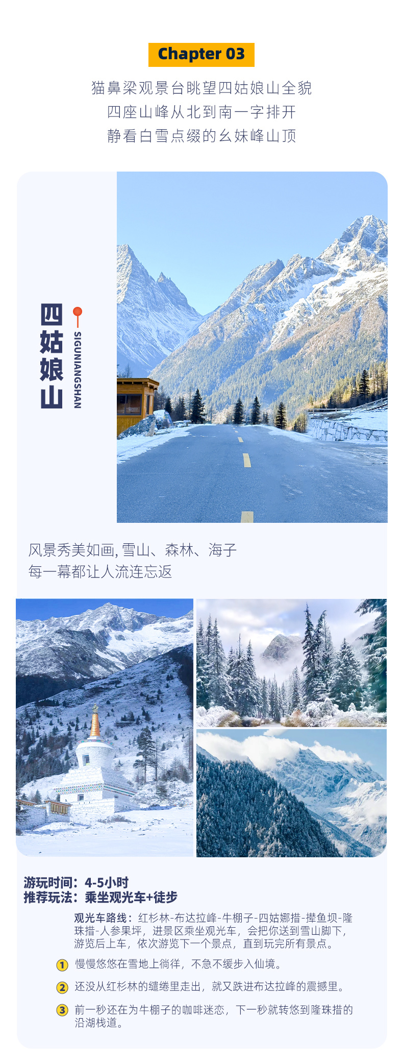 | 特色 | ● | 猫鼻梁观四姑娘山全貌、川西小瑞士“双桥沟” |
