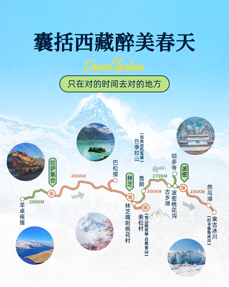 林芝桃花+波密桃花+索松村+然乌湖+来古冰川+巴松措+羊卓雍措7日游