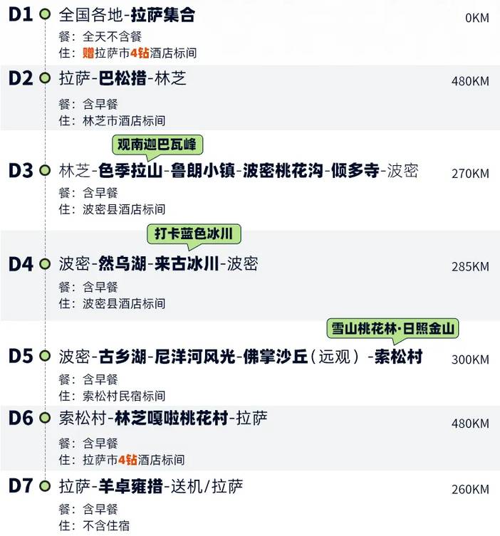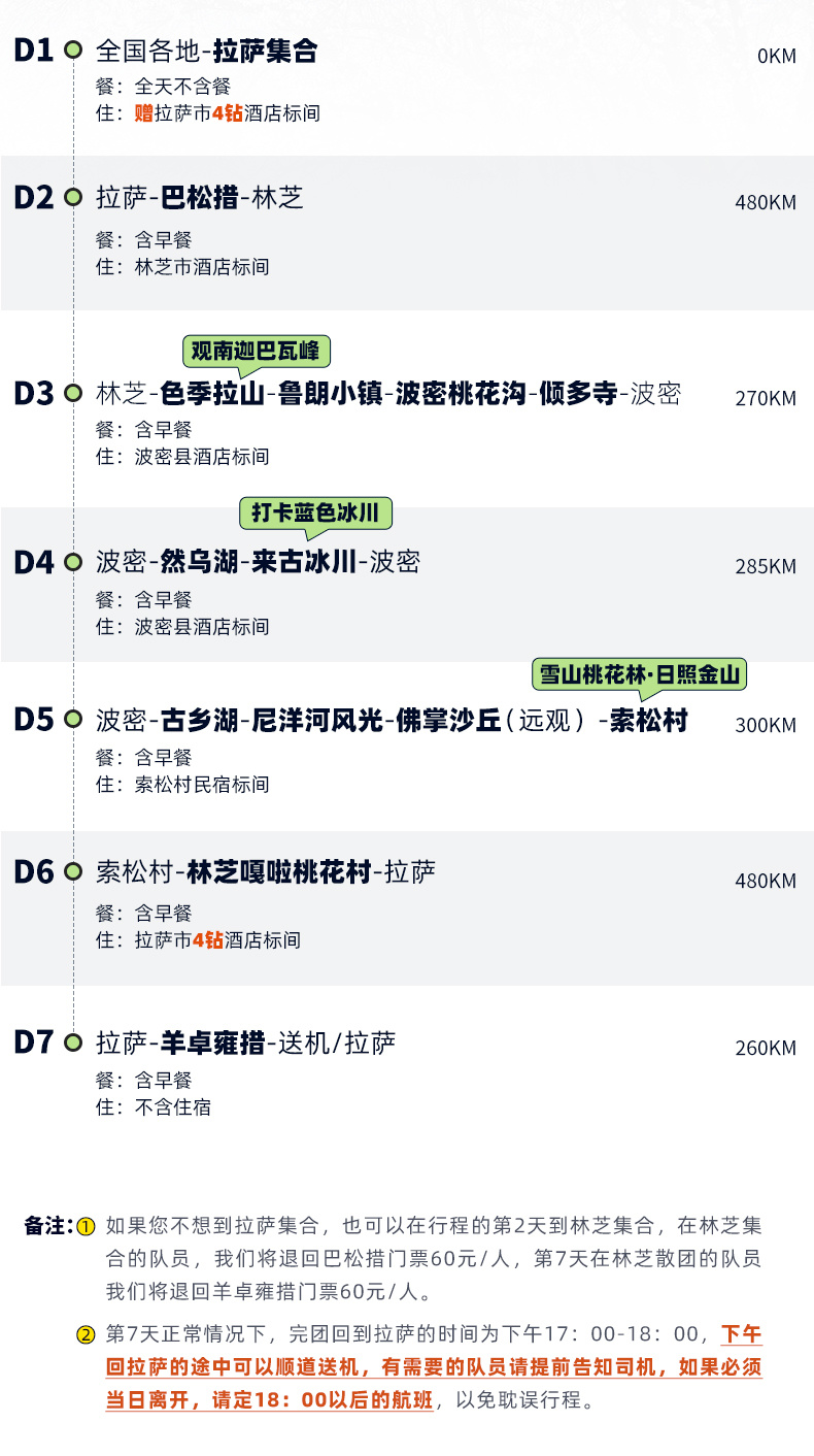 1、交通:根据人数确定车辆(已含驾驶员食宿); 2、住宿:全程6晚住宿(含集合日赠送1晚4钻酒店、不住不退); 3、门票:巴松措门票、来古冰川门票、嘎拉桃花村门票、雅鲁藏布江大峡谷北岸(索松村)门票、羊湖门票; 4、导游: (1)20人大团:1-8人司机兼向导,9人及以上配专职导游,已含导游食宿门票; (2)8人小团:全程司机兼向导,已含驾驶员食宿、油费、过路费,驾驶员熟悉线路,会给队员提供行程建议,但不会像专业导游一样解说,且不陪同队员进景区,请理解; 5、随团配备:急救包+血氧仪+温度计,随时观察了解客人的身体状况。 |
