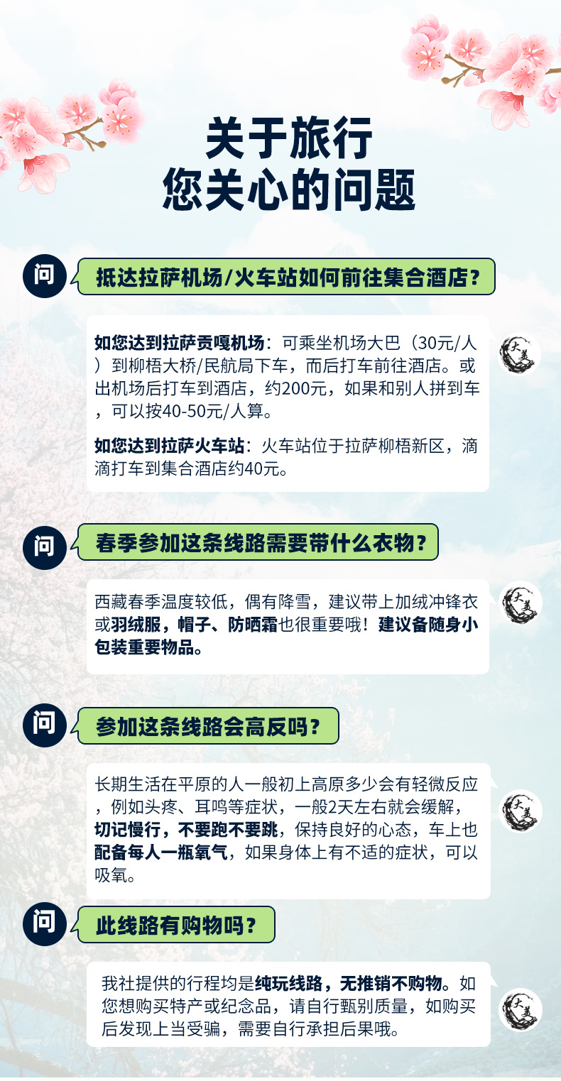 春季限定,拉萨(或第2天林芝)集合,拉萨(或林芝)完团,连发8期,期期成行,只在对的时间去对的地方。 早鸟优惠: 提前20天报名,立减200元/人! 提前10天报名,立减100元/人! 8人精品小团/20人散拼大团(二选一)报名时候选择 注: 8人精品小团:司机兼向导,8人封团。 20人散拼大团:9人即配专业导游,20人封团。 第1期:2026.03.22-----2026.03.28 第2期:2026.03.24-----2026.03.30 第3期:2026.03.26-----2026.04.01 第4期:2026.03.28-----2026.04.03 第5期:2026.03.30-----2026.04.05 第6期:2026.04.01-----2026.04.07 第7期:2026.04.03-----2026.04.09 第8期:2026.04.05-----2026.04.11 活动费用:4780元/人,单房差1300元/人 早鸟优惠: 提前20天报名,立减200元/人! 提前10天报名,立减100元/人! 活动有自费项,注意查看费用不含 线路纯玩,不安排购物点 |
