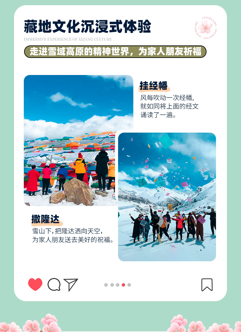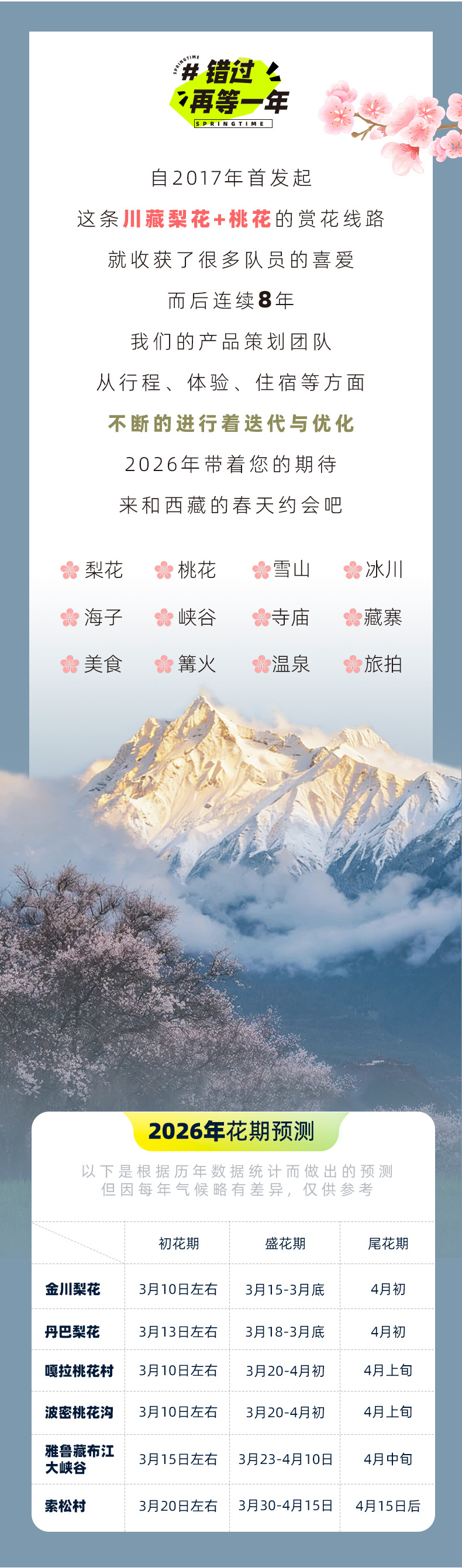 春季限定,成都集合,拉萨完团,连发8期,期期成行,只在对的时间去对的地方。 早鸟优惠: 提前30天报名,立减500元/人! 提前20天报名,立减400元/人! 提前10天报名,立减300元/人! 为保障最佳观赏体验,在行程第9天我们根据桃花花期的差异设计了2种方案,您可根据偏好选择心仪的团期出发。 方案一:第9天(赏雅鲁藏布江大峡谷沿线桃花+住林芝酒店) 第01期:2026.03.16成都集合-------2026.03.25拉萨完团 (5580元/人,单房差1600元/人) 第02期:2026.03.18成都集合-------2026.03.27拉萨完团 (5580元/人,单房差1600元/人) 第03期:2026.03.20成都集合-------2026.03.29拉萨完团 (5580元/人,单房差1600元/人) 第04期:2026.03.22成都集合-------2026.03.31拉萨完团 (5580元/人,单房差1600元/人) 方案二:第9天(赏索松村沿线桃花+住索松村民宿) 第05期:2026.03.24成都集合-------2026.04.02拉萨完团 (5780元/人,单房差1800元/人) 第06期:2026.03.26成都集合-------2026.04.04拉萨完团 (5780元/人,单房差1800元/人) 第07期:2026.03.28成都集合-------2026.04.06拉萨完团 (5780元/人,单房差1800元/人) 第08期:2026.03.30成都集合-------2026.04.08拉萨完团 (5880元/人,单房差1800元/人)第08期升级摄影师全程跟拍 备注:选择第08期出发的队员,此团期15人及以上安排摄影师全程跟拍,赠10张简修+底片全送(电子版),如最终成团人数未达到15人,则按5780元/人价格执行。 早鸟优惠: 提前30天报名,立减500元/人! 提前20天报名,立减400元/人! 提前10天报名,立减300元/人! 活动有自费项,注意查看费用不含 线路纯玩,不安排购物点 |