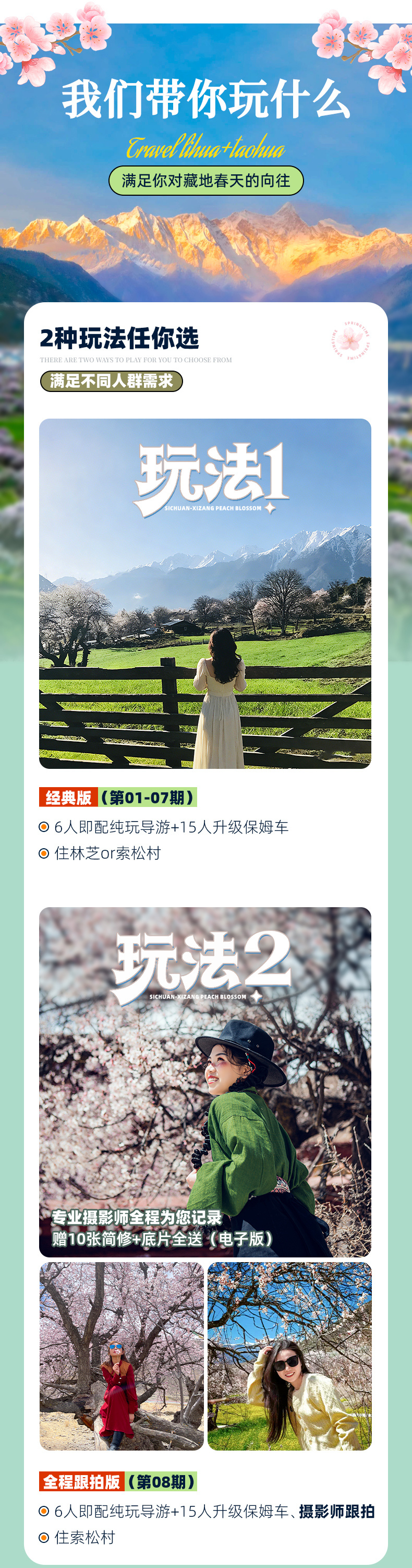 为保障最佳观赏体验,在行程第9天我们根据桃花花期的差异设计了2种方案,第01-04期雅鲁藏布江大峡谷沿线桃花更盛,第05-08期索松村沿线桃花更盛,您可根据偏好选择心仪的团期出发。