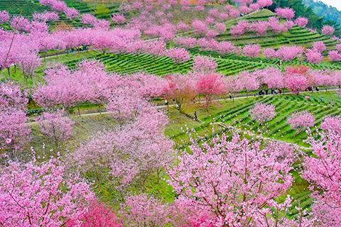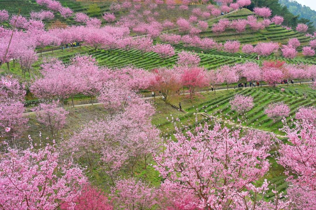 万株樱花在千亩茶田间恣意绽放