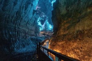 洞天盛境是国内罕见的总长约3公里的地下大峡谷,步入光怪陆离的洞天秘境,仿佛穿梭于时间与空间的裂缝之中。这里是明星同款打卡地,沿着曲折蜿蜒的栈道缓缓深入,演员王丽坤曾驻足的地方逐渐映入眼帘。