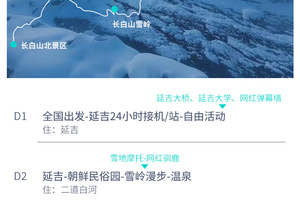 D2 | 第2天,延吉-朝鲜民俗园-雪岭漫步-雪地摩托-网红驯鹿-二道白河 | |