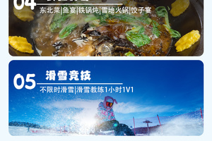 小贴士: 1、滑雪建议穿着短款羽绒服,穿宽松保暖衣物,如没有也可以现场前往滑雪场租雪服。 2、 具体游览项目会根据实际情况做顺序调整。 3、 如遇特殊天气,雪地火锅改成室内火锅,望悉知。 4、 1V1滑雪教练仅包含1小时,如需更多时间滑雪教练费用自理。 |