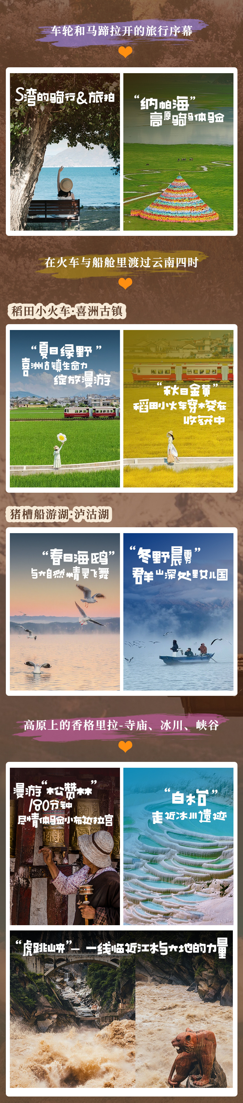 | 哐当驶过翡翠色稻浪的复古车厢里,白族姑娘正在派送用荷叶包裹的茉莉花茶。注意窗外突然惊起的鹭鸟群:当小火车鸣笛穿过彩虹门时,抓拍下的照片会同时收录苍山云线、金色稻浪与飞鸟的三角构图。 | ||