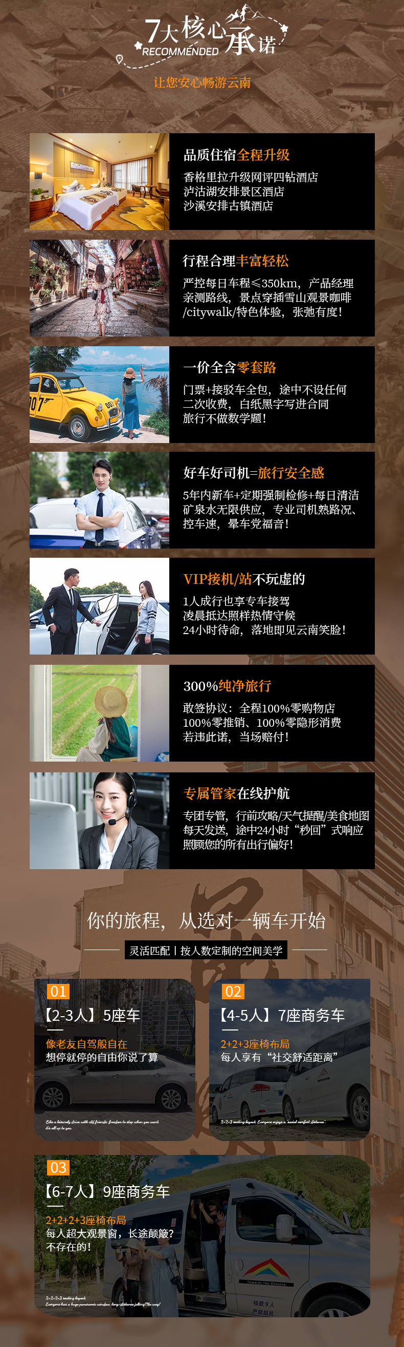 小贴士: 1、如果定丽江火车站返程的朋友,建议定当天18:00之后的高铁或者火车。 2、如果定丽江机场返程的朋友,建议定当天19:00之后的航班。 3、需要送机送站的小伙伴提前1天联系客服预定,5座车100元/次,7座车150元/次,9座车200元/次。 4、如果当天不走的小伙伴,也可以联系客服代订酒店。 |