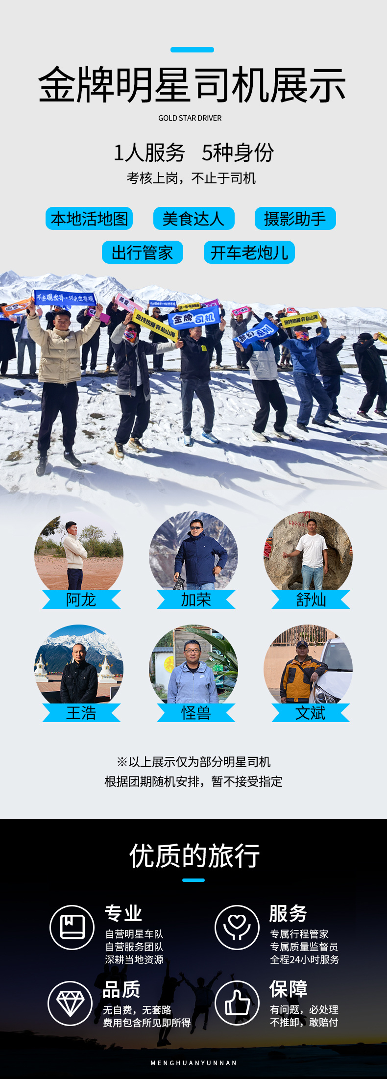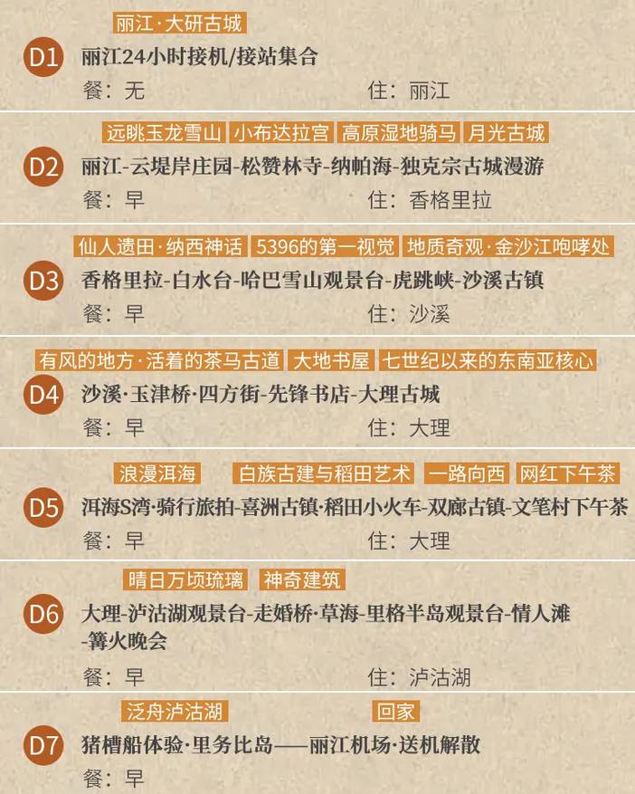 1、标配住宿参考如下: 丽江酒店1 晚三钻 (参考:禧玥美宿酒店(丽江古城店)或丽江璟瑞酒店或丽江吉铂隆大酒店或漫柏豪庭酒店(丽江古城店)或同等级)、 沙溪三钻酒店/民宿1晚 (参考酒店:沙溪一半民宿或沙溪古镇云归处客栈或沙溪古镇三家巷客栈(二号院)或沙溪古镇一方庭民宿或沙溪古镇玉峰客栈或同等级)、 泸沽湖1晚三钻酒店/客栈 (参考:泸沽湖清枫别院或一朵·天空之镜度假酒店或泸沽湖泸沽庄园酒店或同等级)、 大理酒店2晚三钻 ( 参考:江南居精品酒店或础云酒店或云悦楠舍或大理漫步思语度假酒店或花筑·大理古城睿苑客栈或同等级)、 香格里拉1晚四钻酒店 (参考:香格里拉兰欧国际酒店或香格里拉月光国际大酒店或香格里拉日月星城大酒店或同等级); 3、用车: 2-3人安排5座车,4-5人安排7座商务车,6-7人安排9座商务车; 4、门票: 泸沽湖门票,猪槽船,篝火晚会,虎跳峡,白水台,松赞林寺(含景交车); 5、司导: 司机兼管家,帮助大家购买门票,给团友游玩建议,无法全程陪同进入收费景区和提供专业讲解等服务,敬请谅解; |